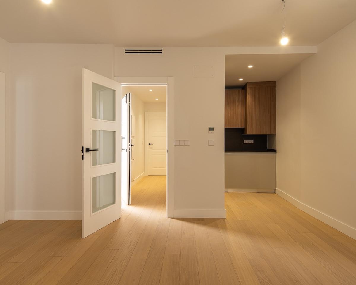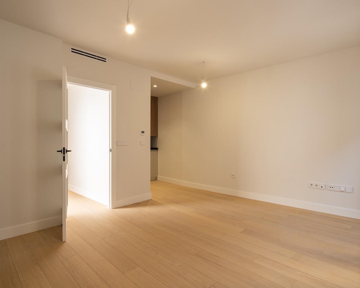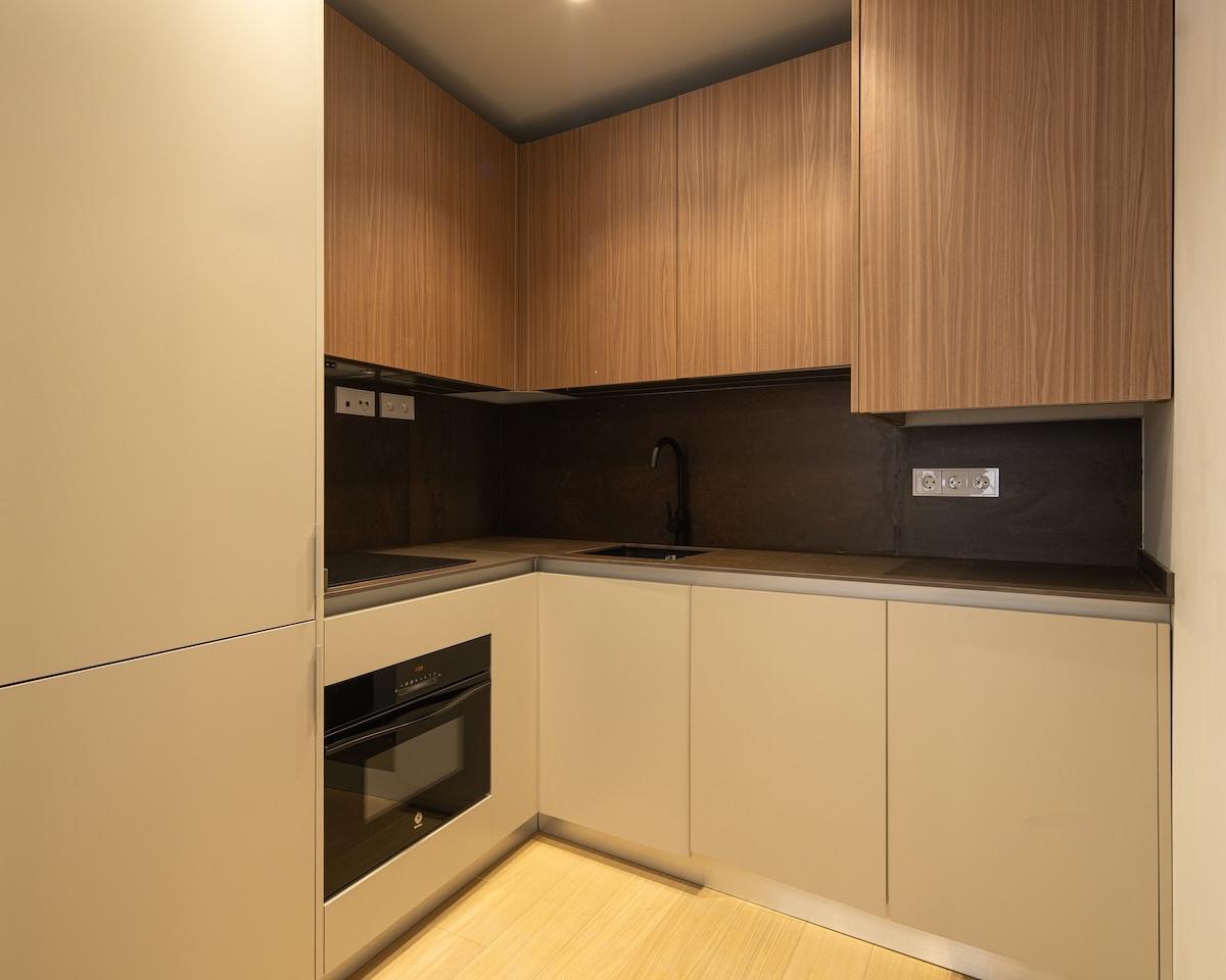 One of the bedrooms is generously sized, easily accommodating a sleeping area and a bright workspace. The second bedroom and a stylish bathroom complete the layout. The living area and fitted kitchen are slightly separated, maintaining connection while giving each space its own character.