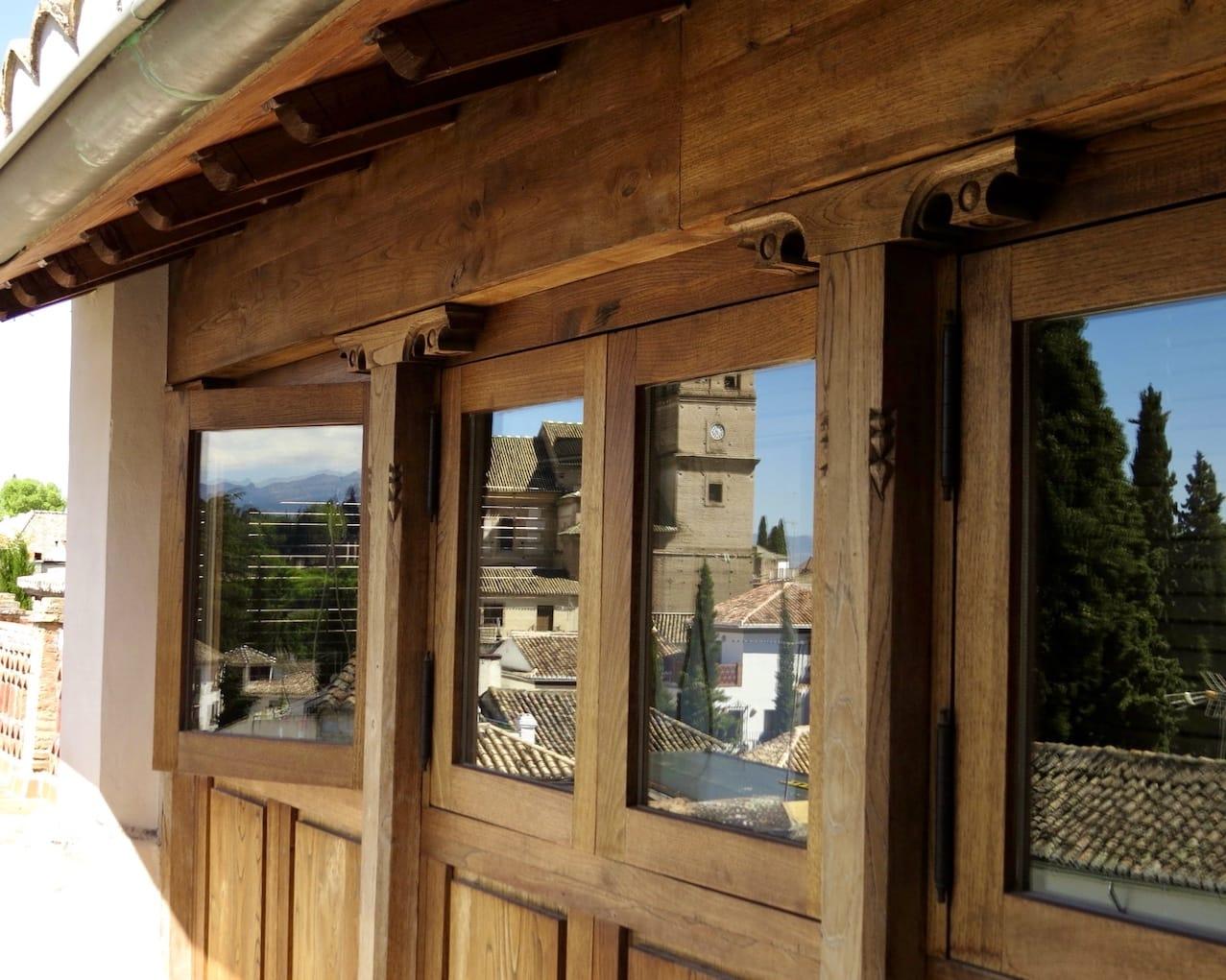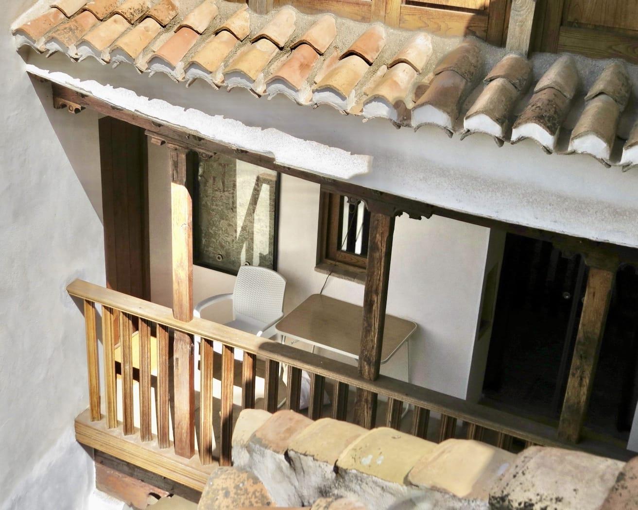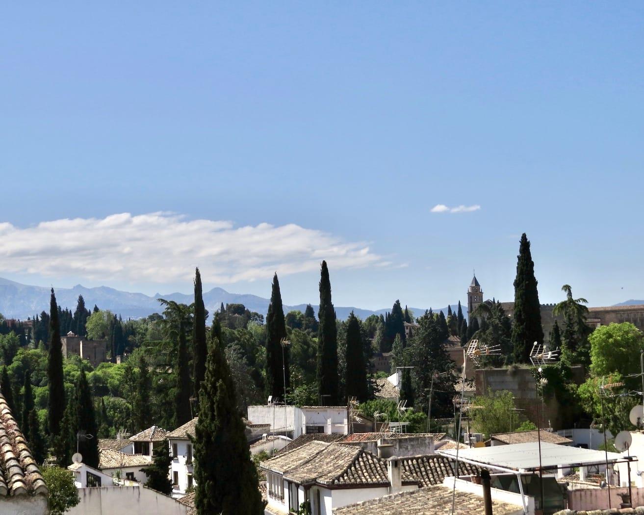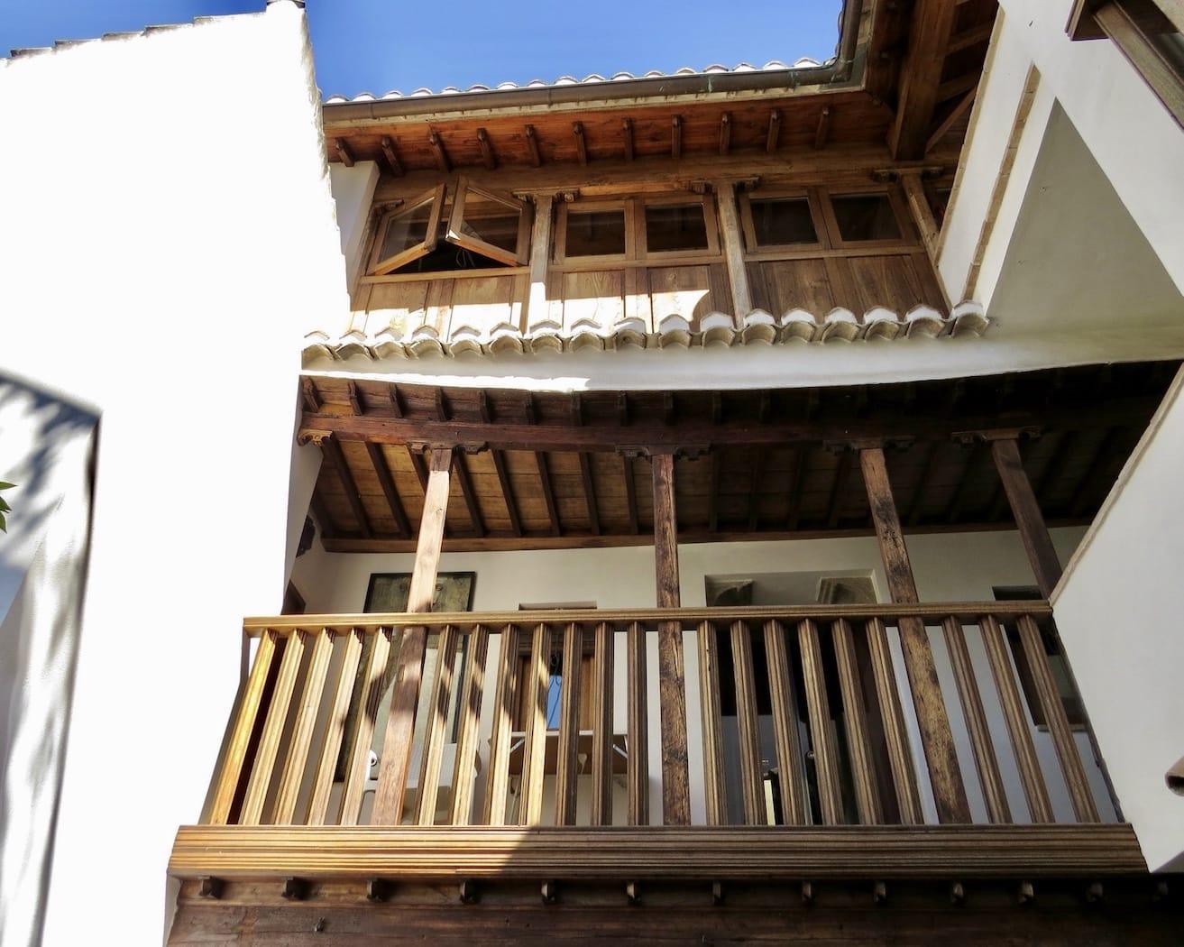 Above this on the second floor is a large bedroom with en-suite bathroom. This room, and the gallery that gives access to it, look straight across at the Alhambra.