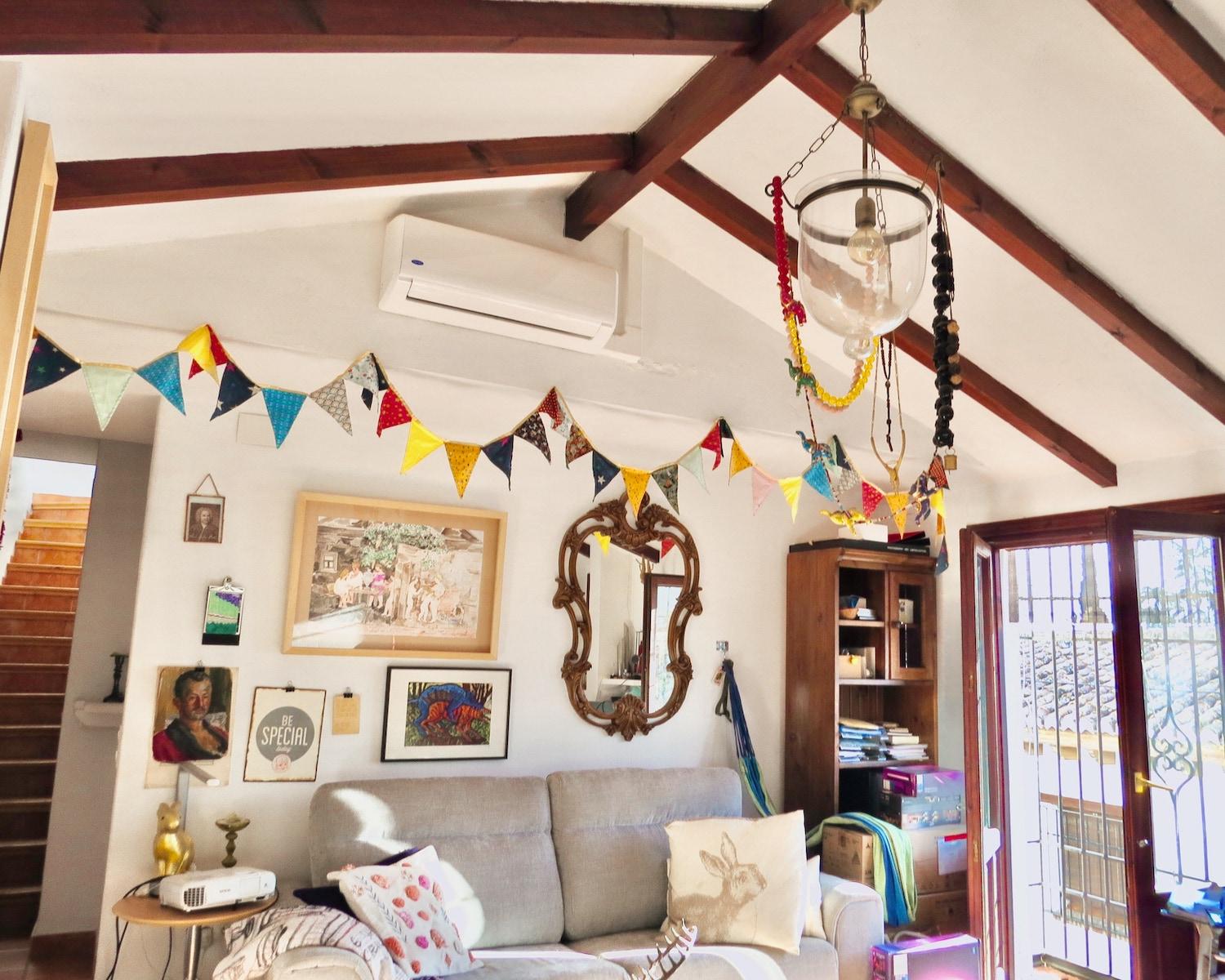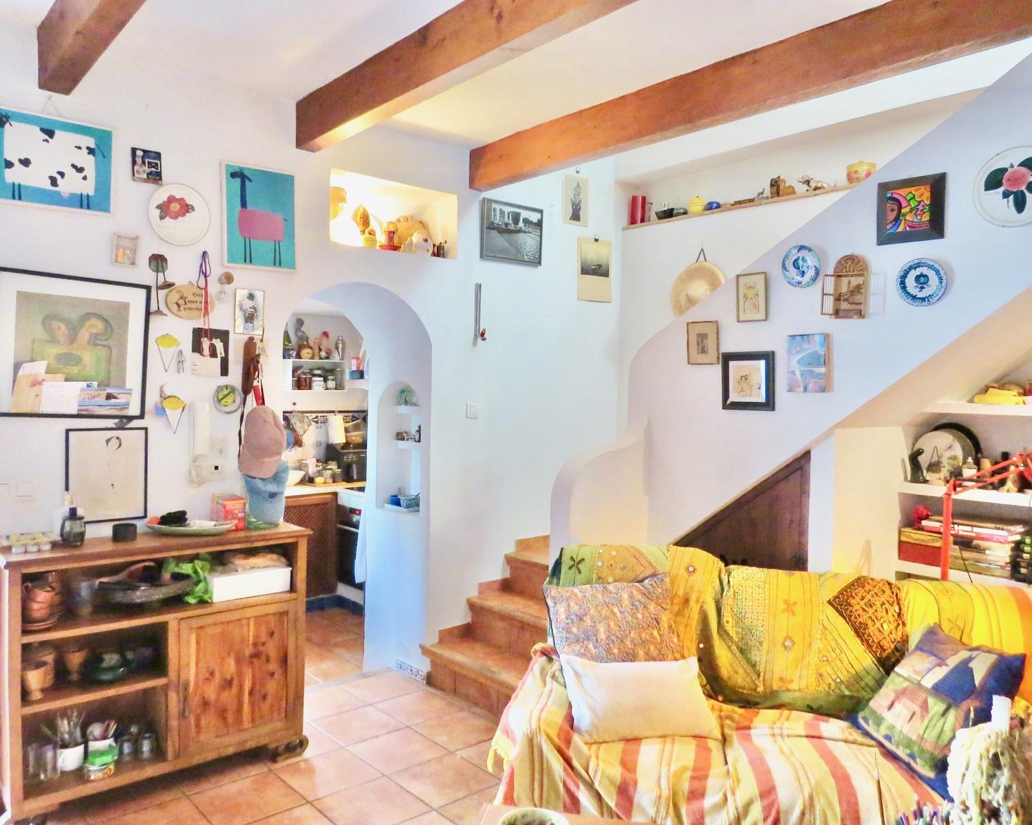 Traditional wooden beams, terracotta tiles, and a crisp white palette enhance the home’s character, while modern conveniences like air conditioning and heating ensure year-round comfort. The flexible layout provides plenty of potential to adapt the spaces to suit your needs.