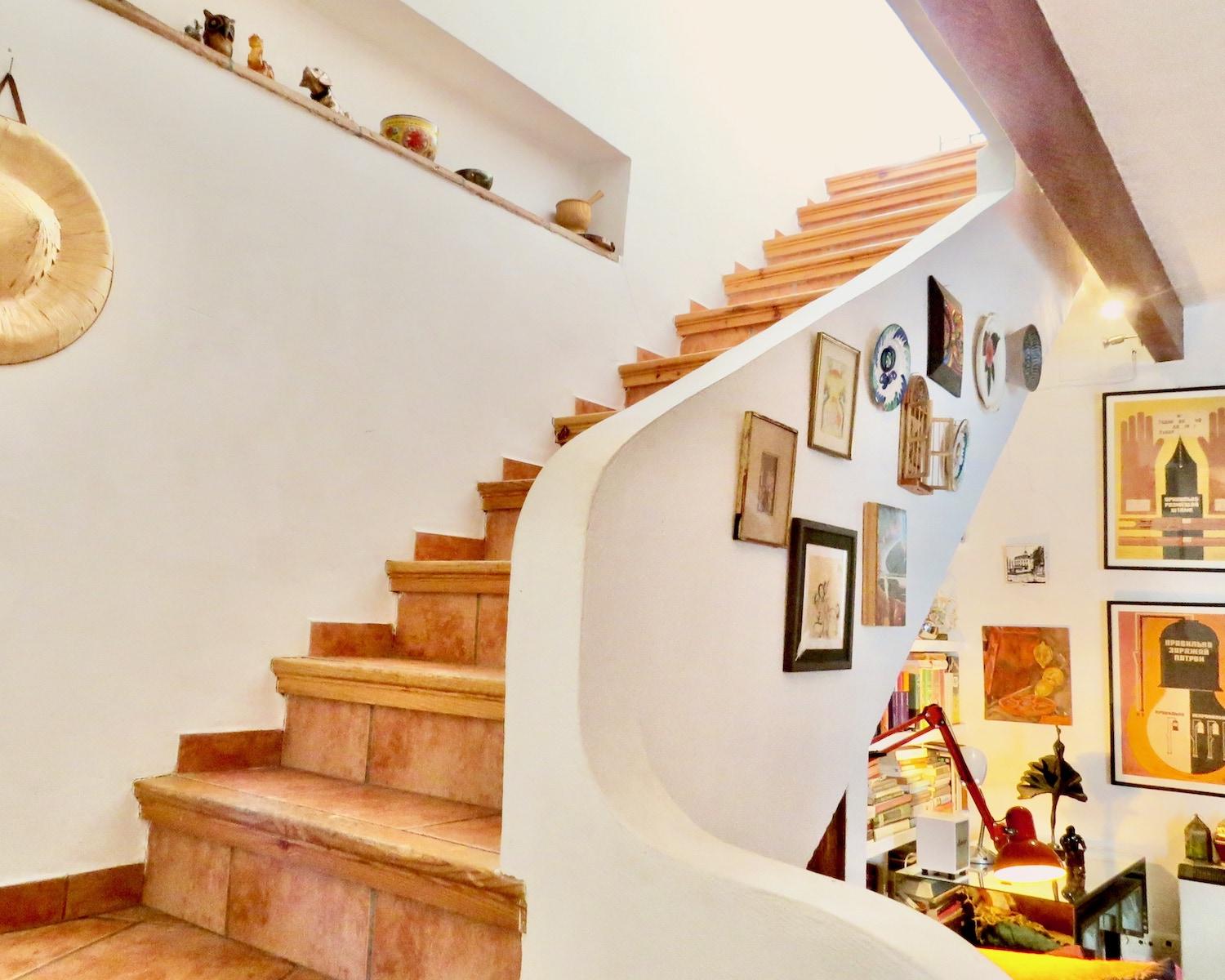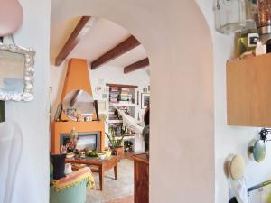 Entering the property, you’ll find a lovely patio garden with enough space to grow a variety of plants and include outdoor seating. It leads to a spacious open-plan living and dining area where handcrafted details catch the eye, from the curved staircase with built-in bookcases to the sculpted fireplace and elegant archways. The living space flows into a fully equipped kitchen with integrated appliances. On this level, there’s also a guest bedroom with fitted wardrobes, a bathroom, and a utility room.