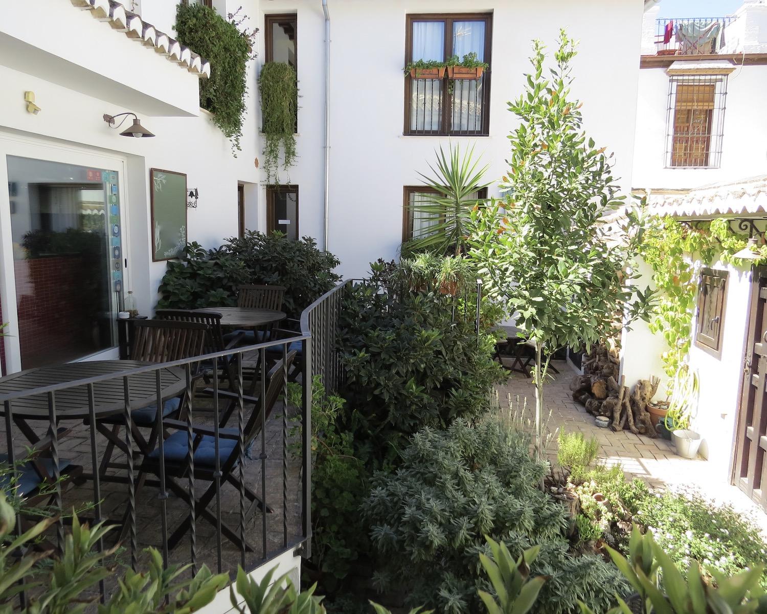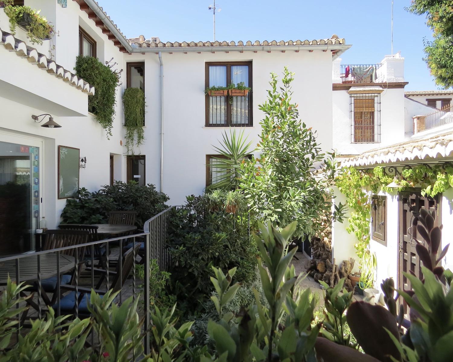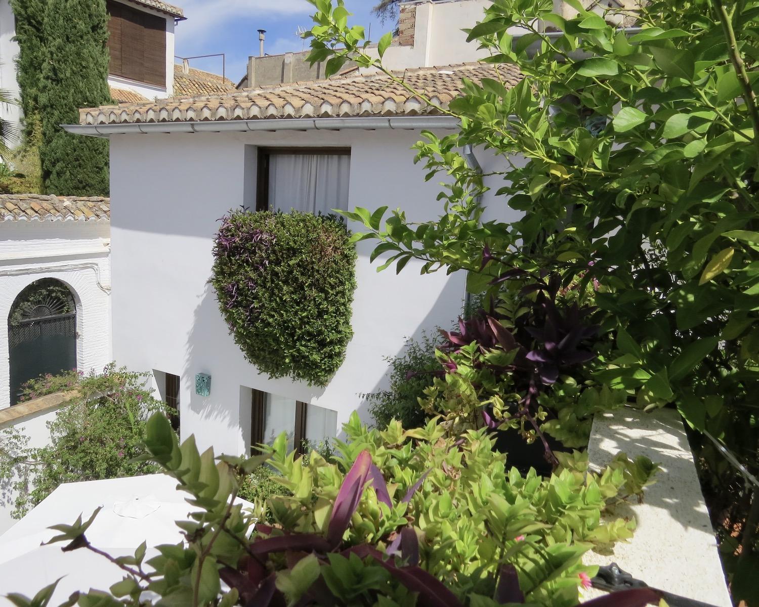 One of these rooms opens onto a plant-draped terrace with seating and views towards the Alhambra
