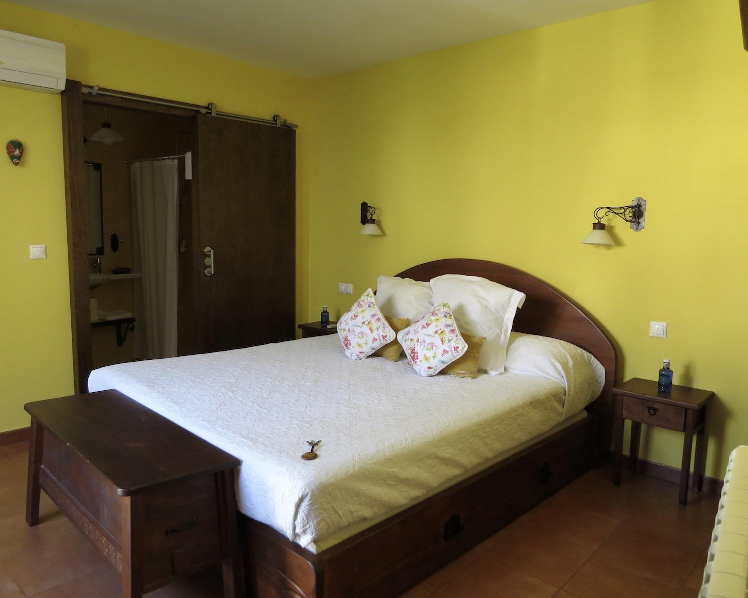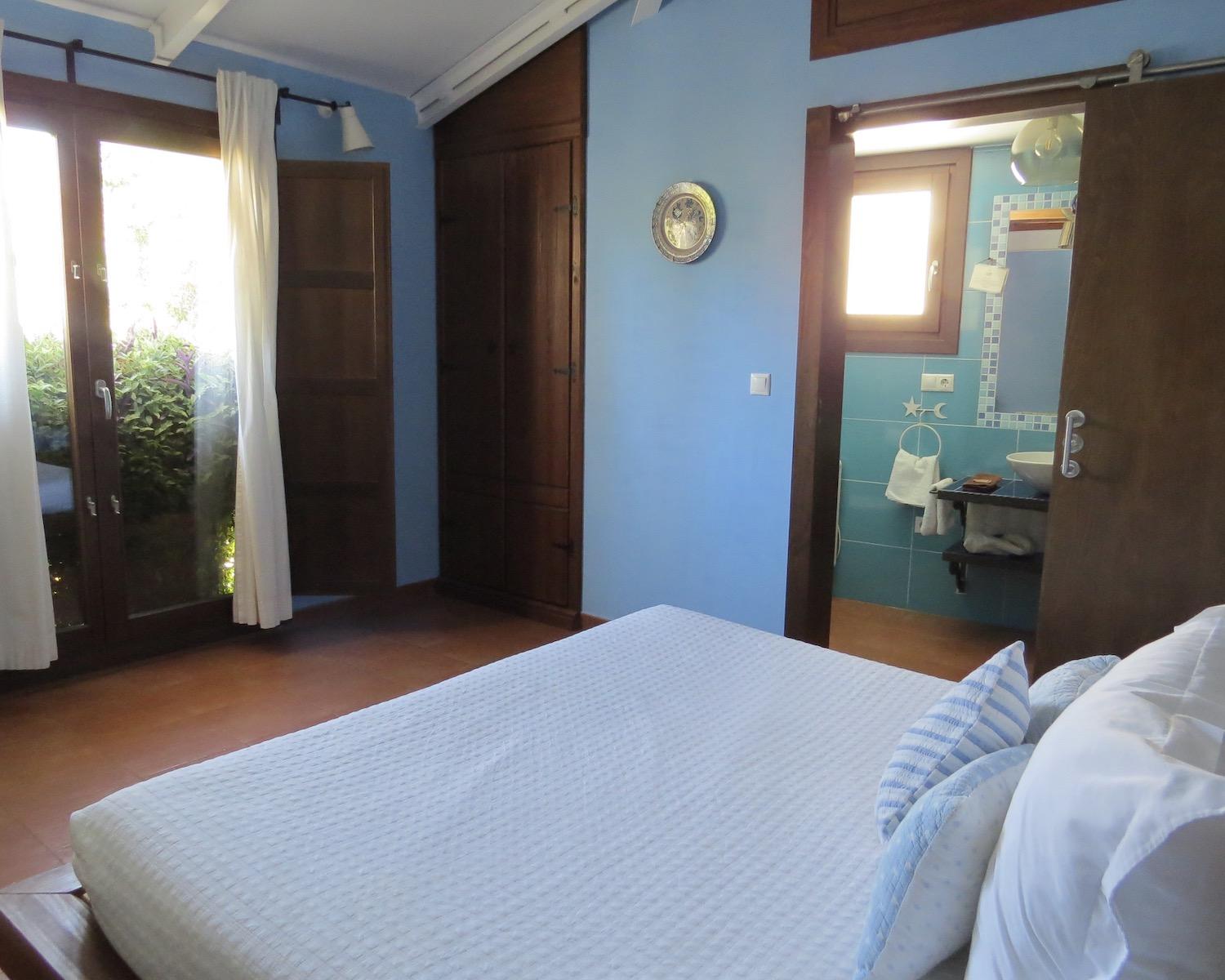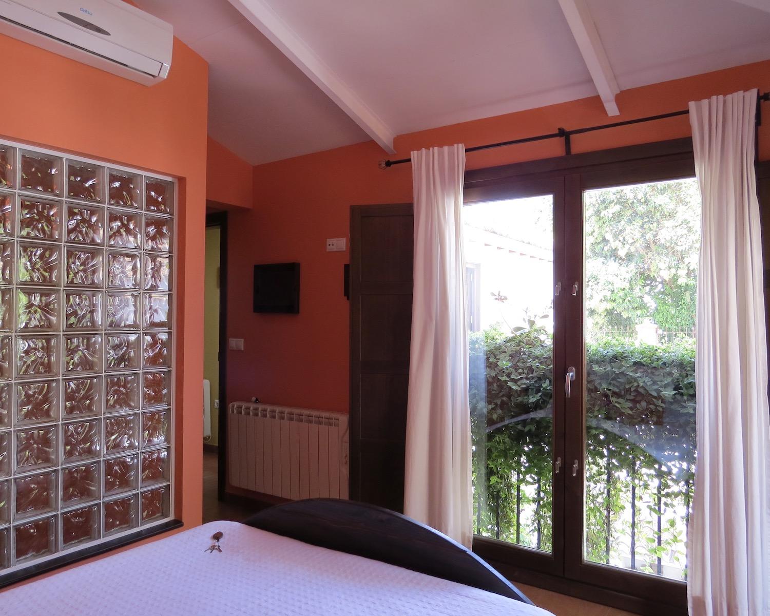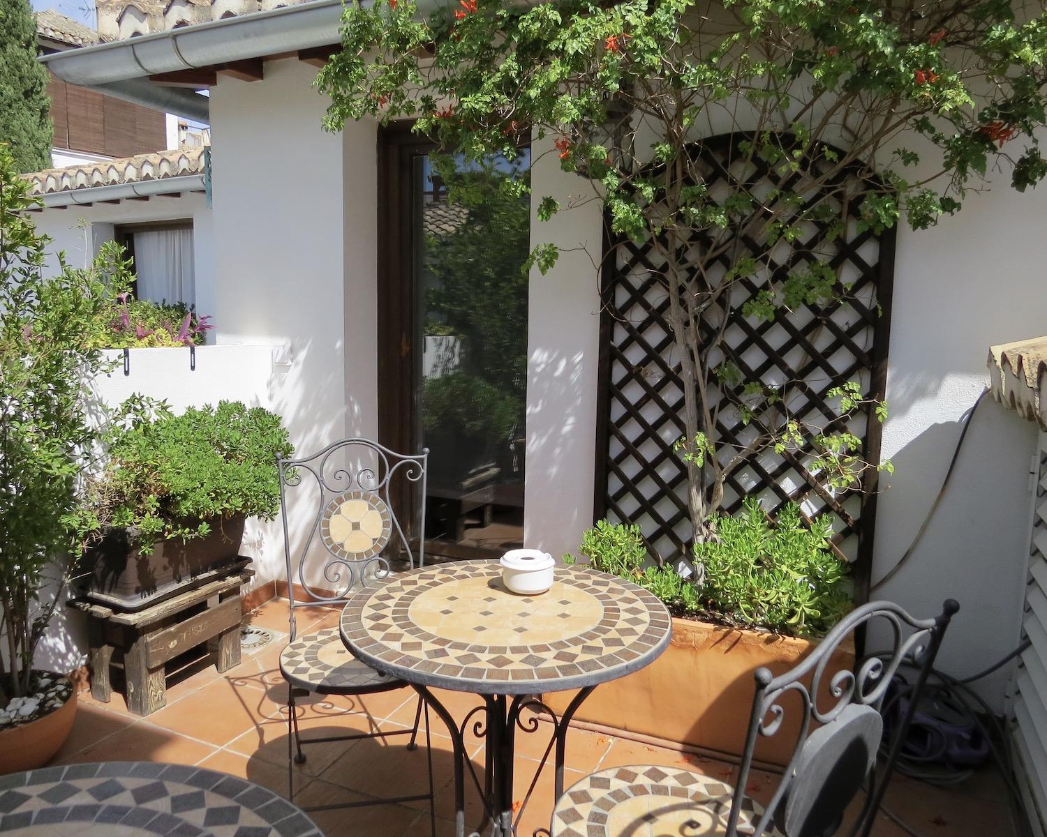 One of these rooms opens onto a plant-draped terrace with seating and views towards the Alhambra