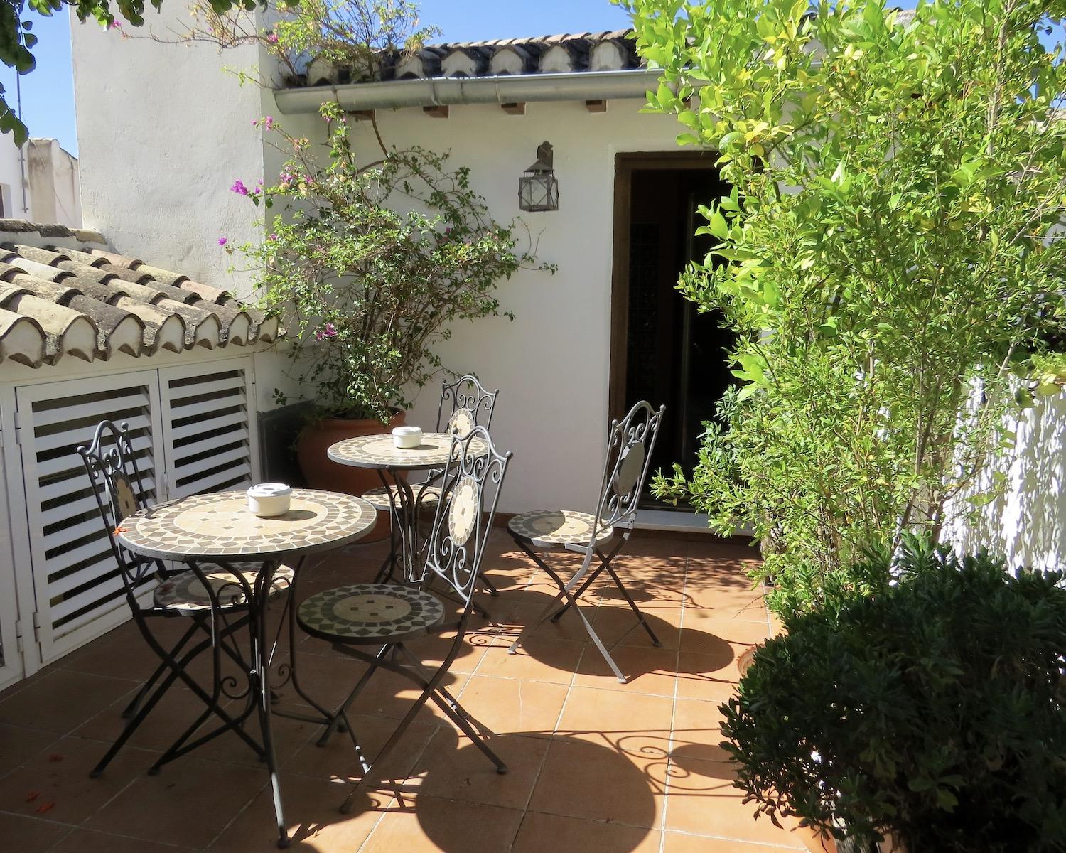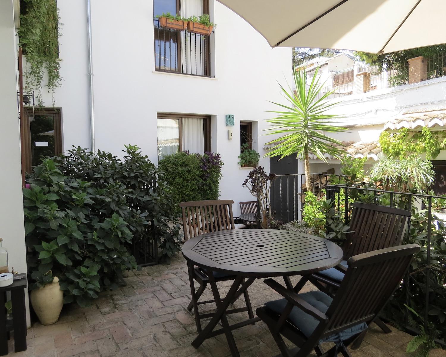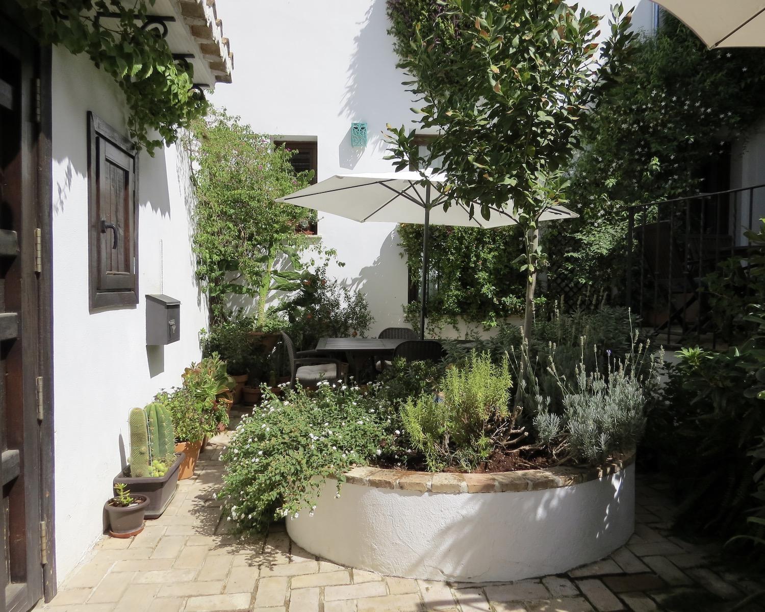 The entrance gate opens into a charming two-level patio garden filled with plants, shaded seating areas and elegant umbrellas — a peaceful setting for outdoor breakfasts, meals or evening drinks. From the patio, three separate doors lead into the house.