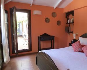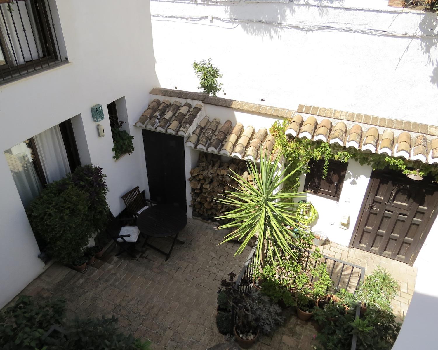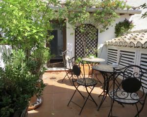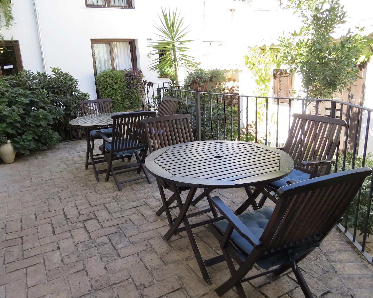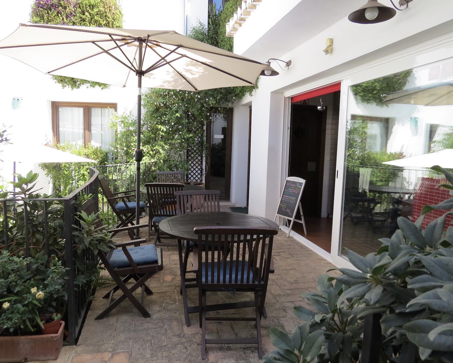 The entrance gate opens into a charming two-level patio garden filled with plants, shaded seating areas and elegant umbrellas — a peaceful setting for outdoor breakfasts, meals or evening drinks. From the patio, three separate doors lead into the house.