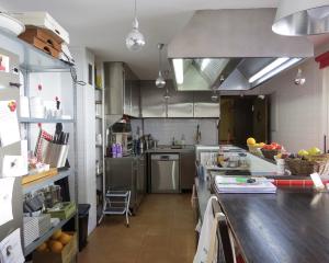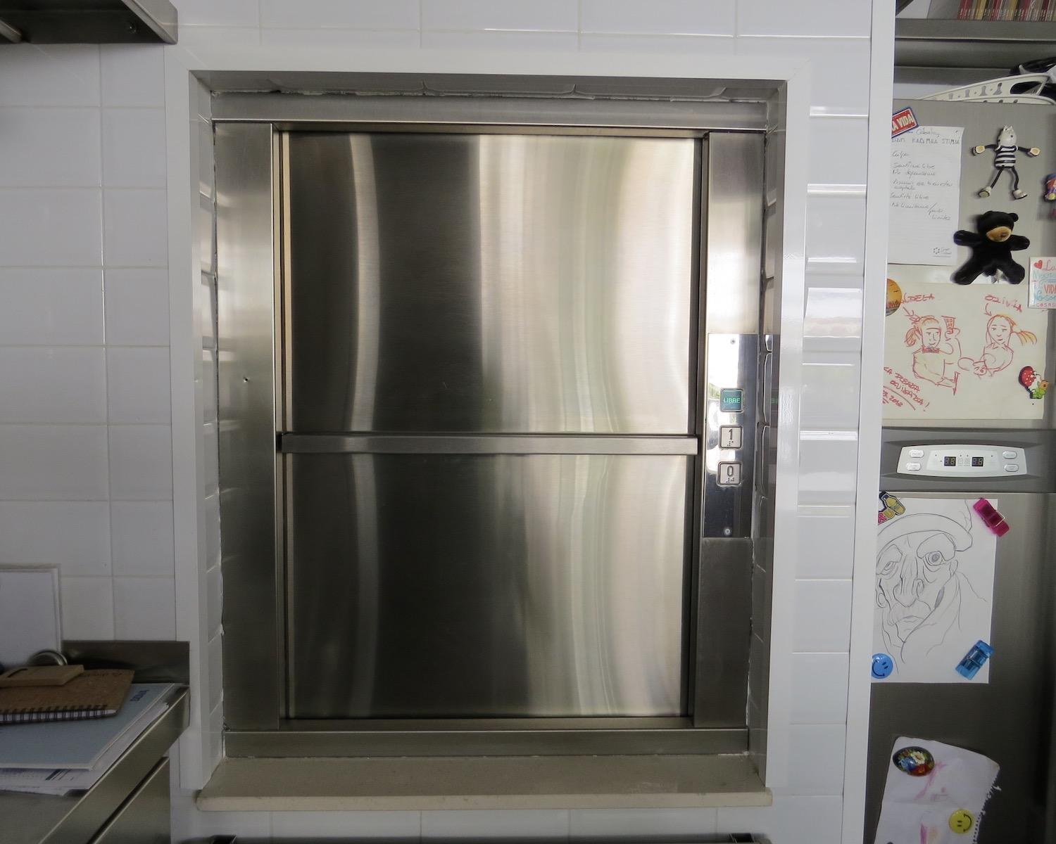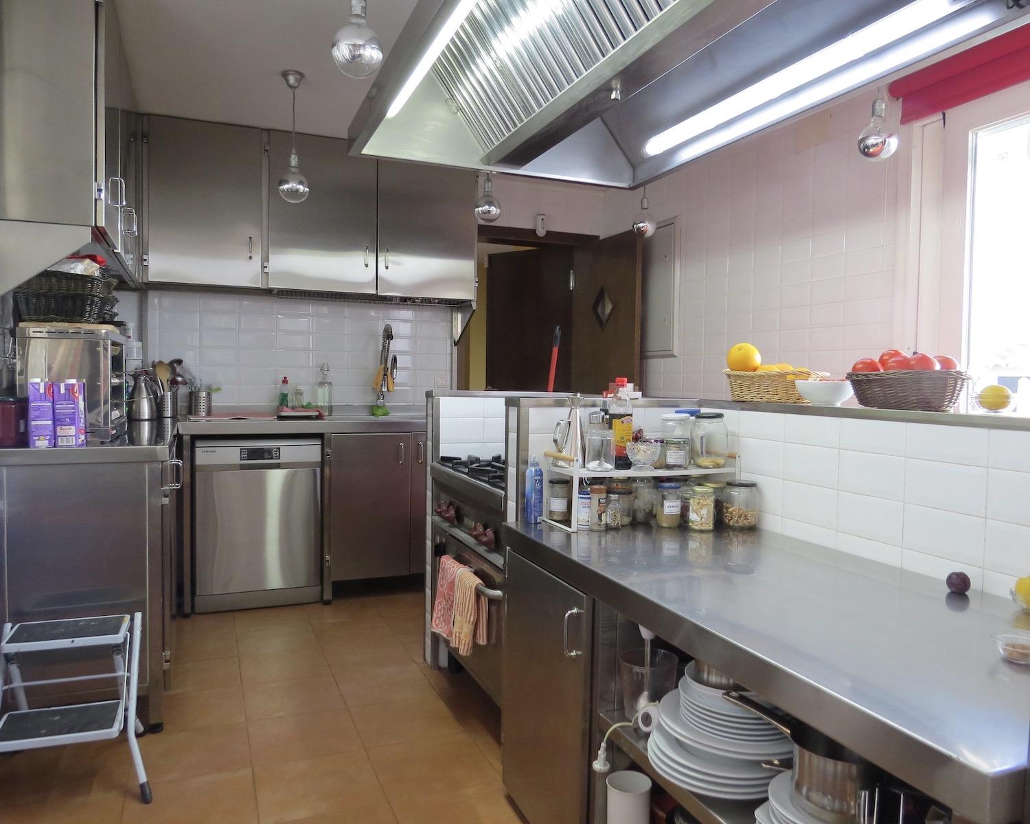 At the centre, large sliding doors open into a fully equipped professional kitchen, designed for guest catering. The kitchen includes a service lift connecting directly to the lower-ground dining hall, allowing food to be sent down efficiently.