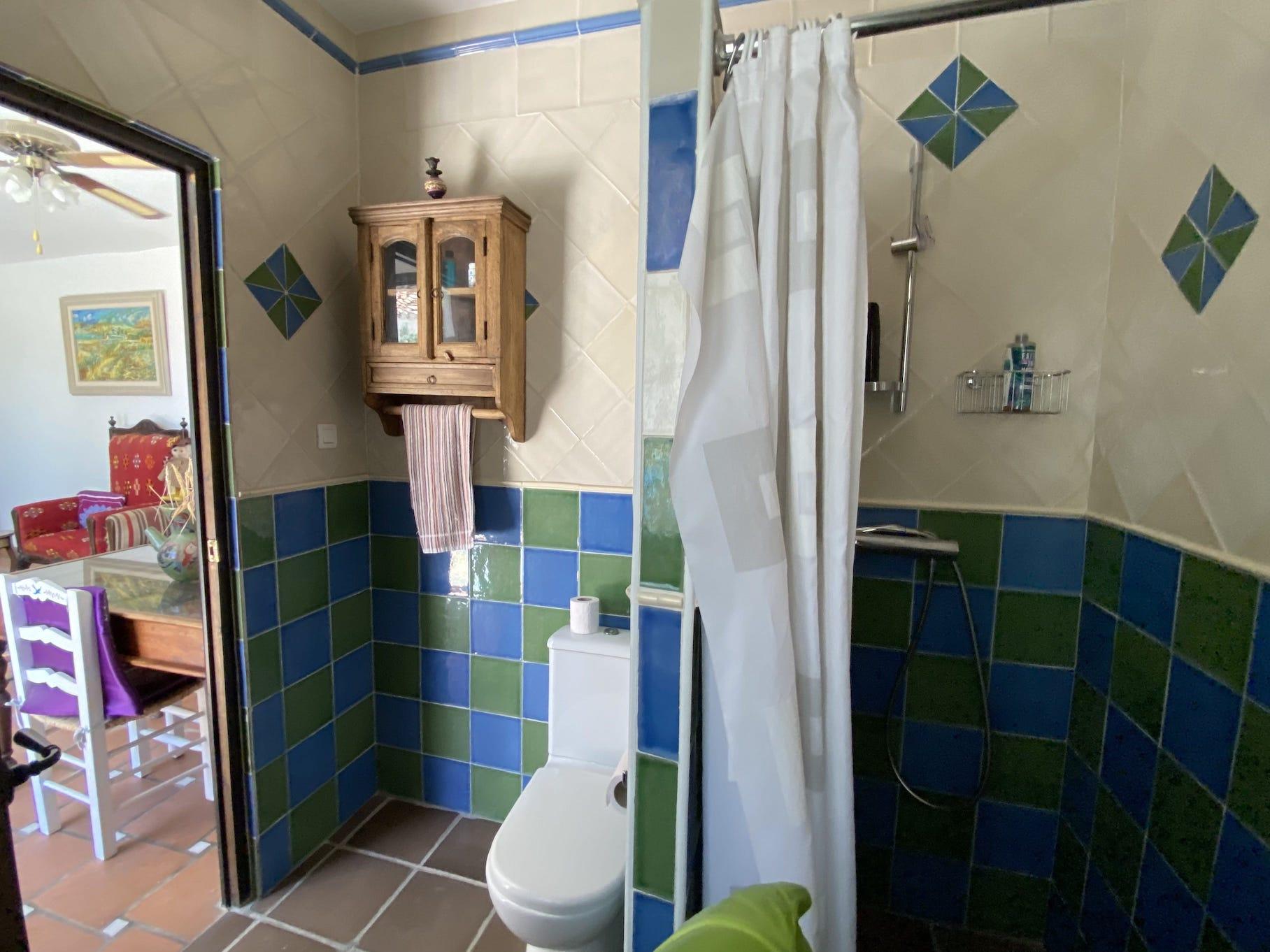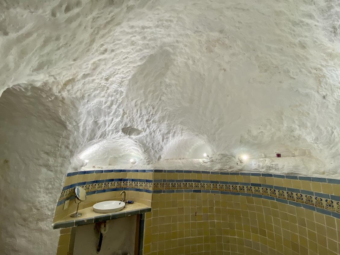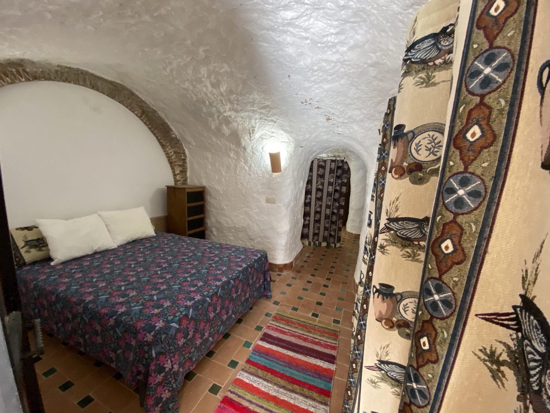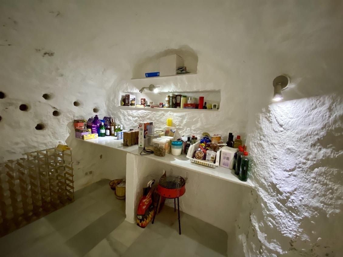 Also located in the patio is a former toilet which now houses a second washing machine and two doors giving access to the hot water tanks. Access to the cave area is also from the patio. Attractive brick arches lead to the lounge, three double bedrooms and a bathroom witha Moorish style sunken tiled bath. A fan with ventilation pipes maintains the caves completely dry at all times. There is no humidity and the caves have no odour associated with damp environments.