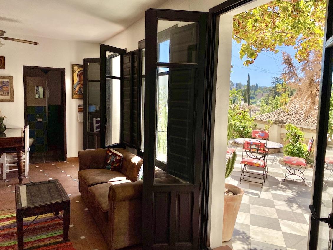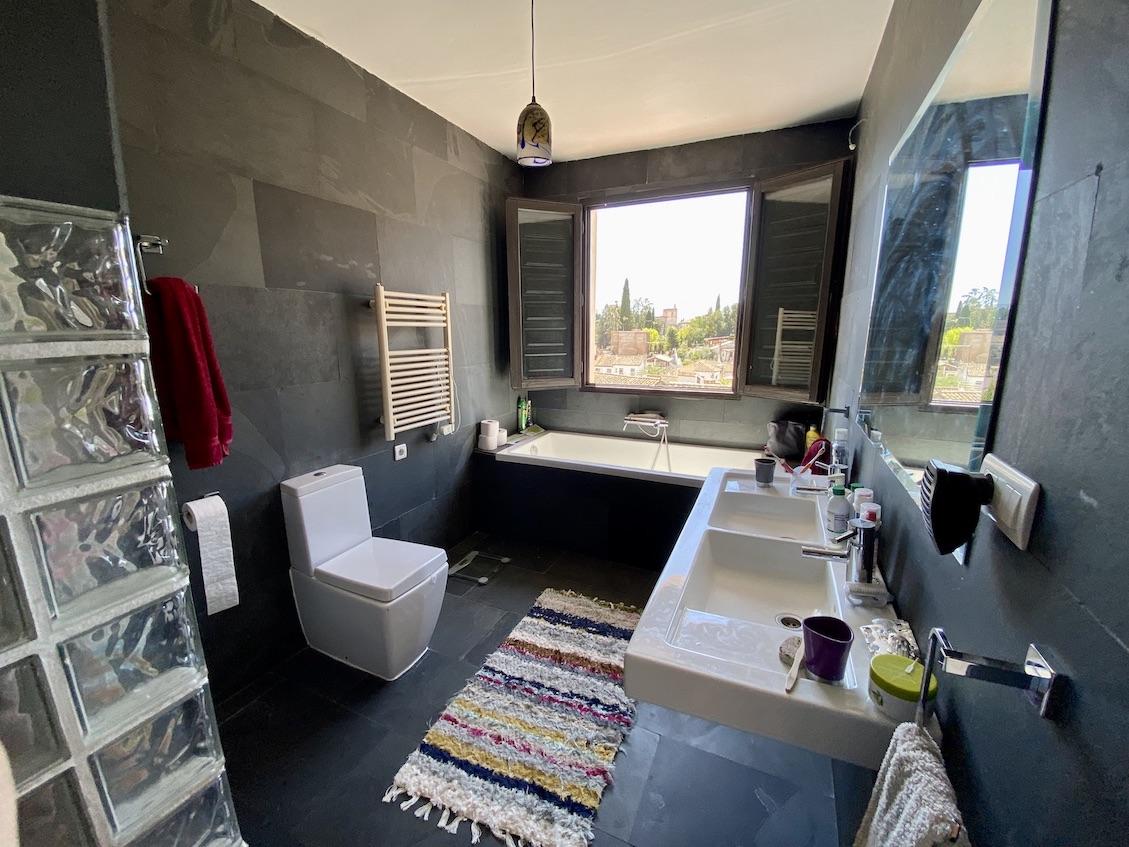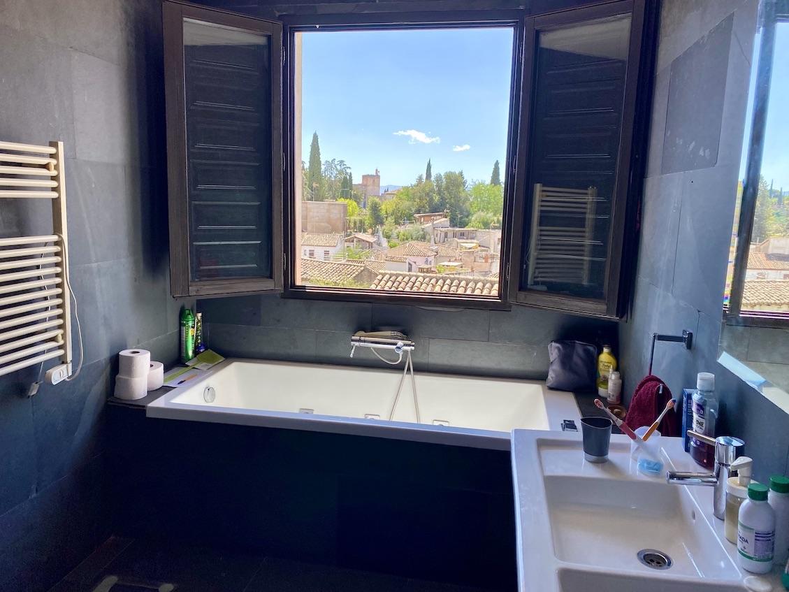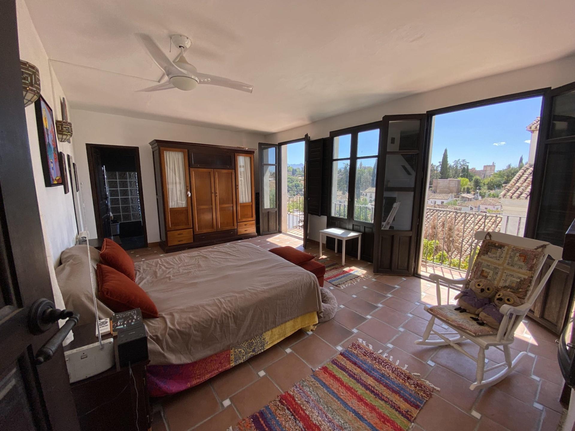 On the first floor accessed by a marble staircase from the hall is the spectacualr master bedroom with three double French doors overlooking the Alhambra and an en-suite bathroom. The bath is positioned under the window for optimum Alhambra views while bathing! The master bedroom enjoys access to the rear patio and, via a flight of steps, to its own privated terrace with views of the Alhambra, the Generalife and the Sierra Nevada. The rear patio has stairs which lead to the largest and highest of the terraces with dining table and marvellous 180º views across the Albayzín, the Alhambra and the Sierra Nevada. From this terrace there are steps up to a door to the street behind which has vehicle access so is ideal for unloading heavy items.