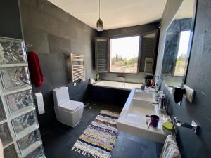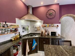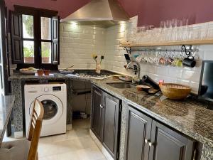 Directly off the terrace is the lounge. With three double French doors to the terrace, the lounge is filled with light. Off the lounge there is a bathroom and a storeroom. Passing through the lounge into the hall, there is the spectacular kitchen with a central island and, unusually, two hobs, one in each corner. There is a breakfast bar built into the island. The kitchen work surfaces are all of granite. The oven is commercial sized, there is a fridge freezer, washing machine and dishwasher. Accessed from the kitchen is a cave which serves as wine cellar and pantry.