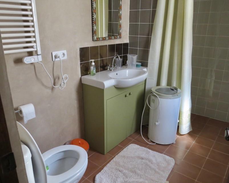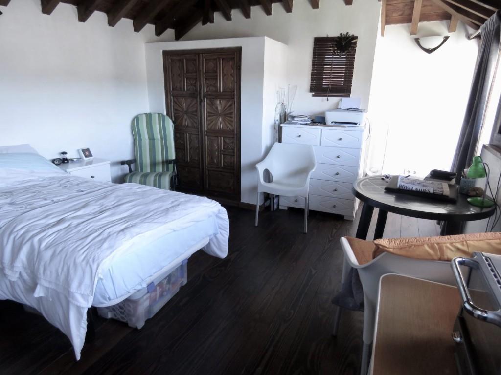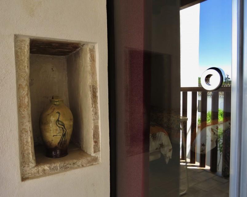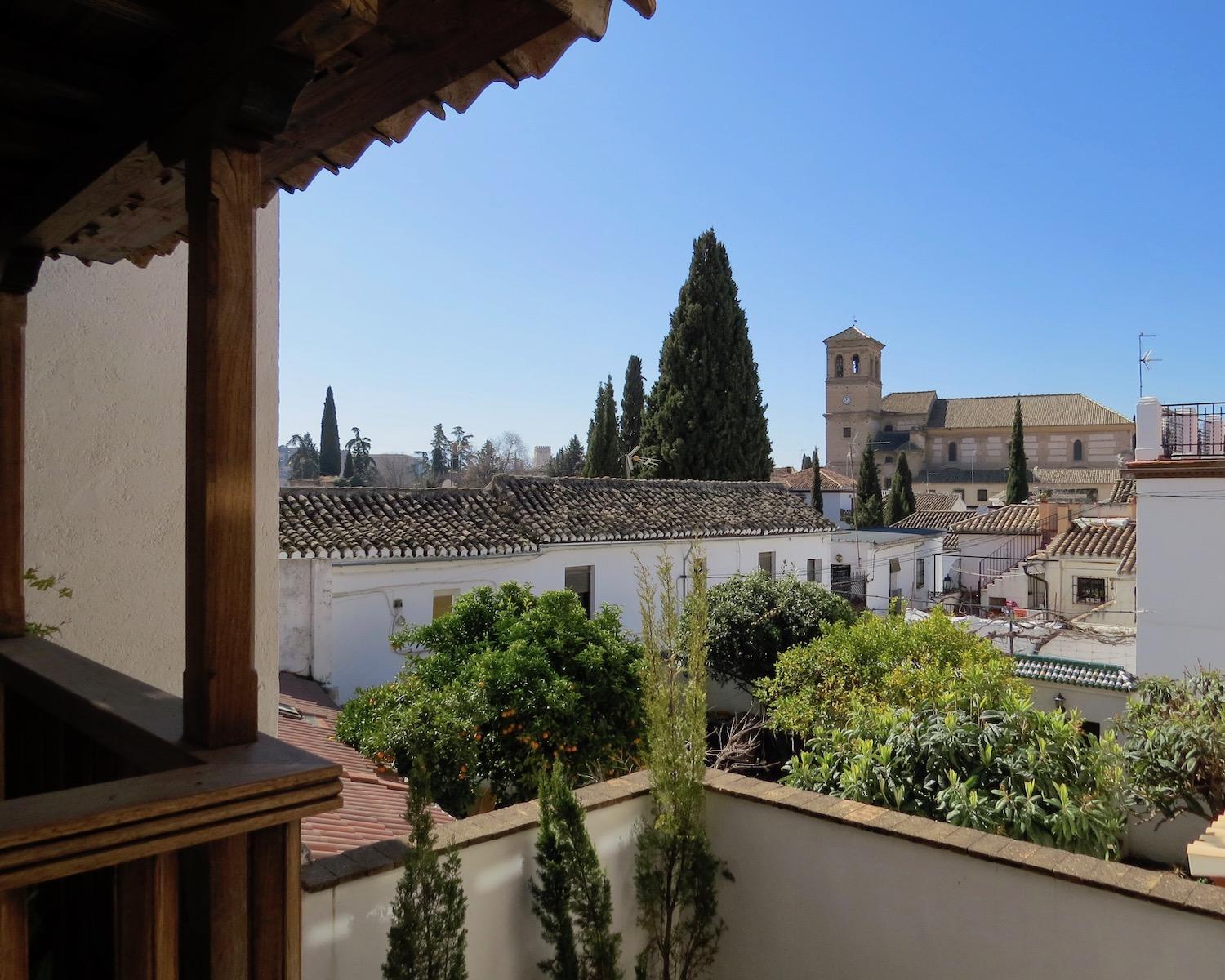 Upstairs, off the beautiful, original, wooden balcony, there are three double bedrooms with en suite bathrooms. The balcony enjoys lots of sunshine and beautiful views of the Albayzin, the Sierra and the Alhambra in the distance. An original wall painting, discovered during the excavation, has been preserved and is on display on the balcony.