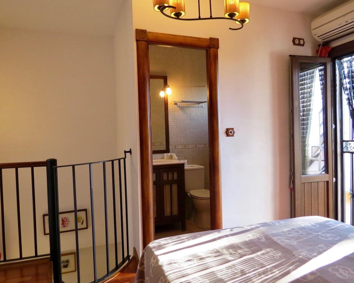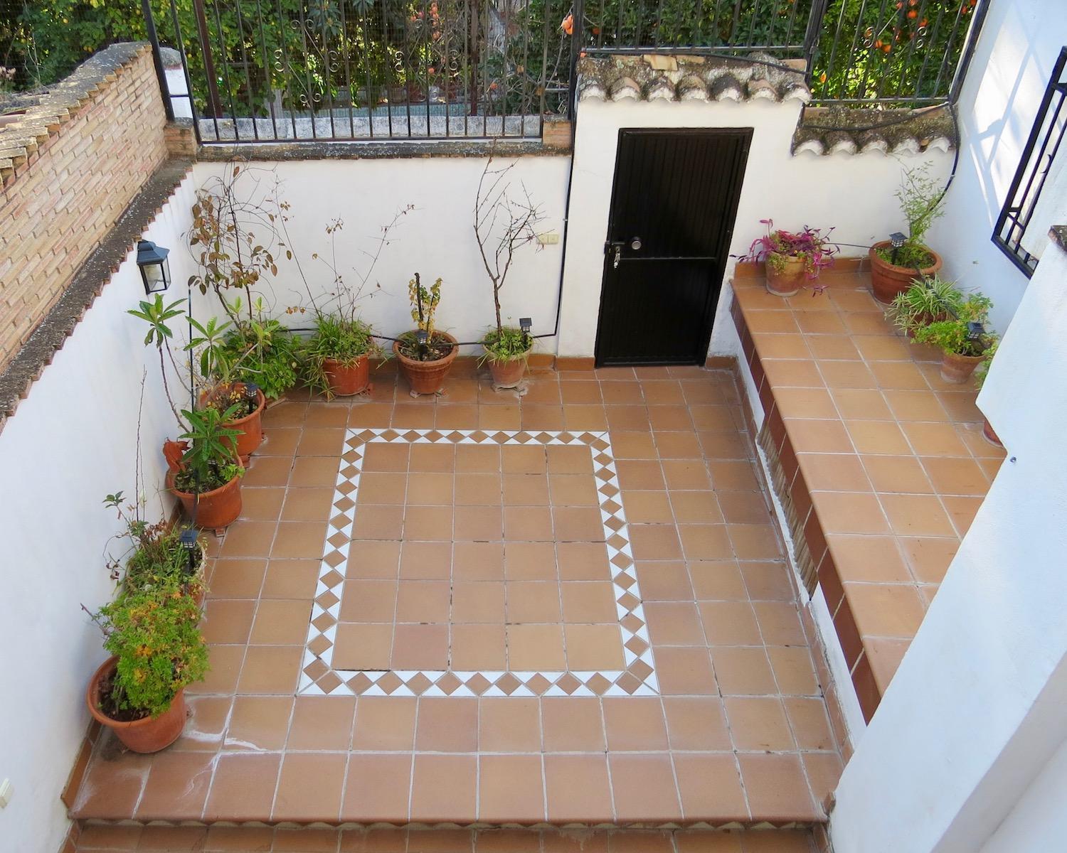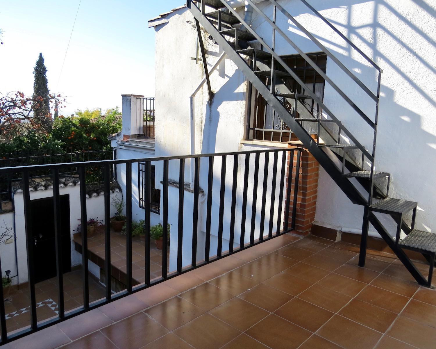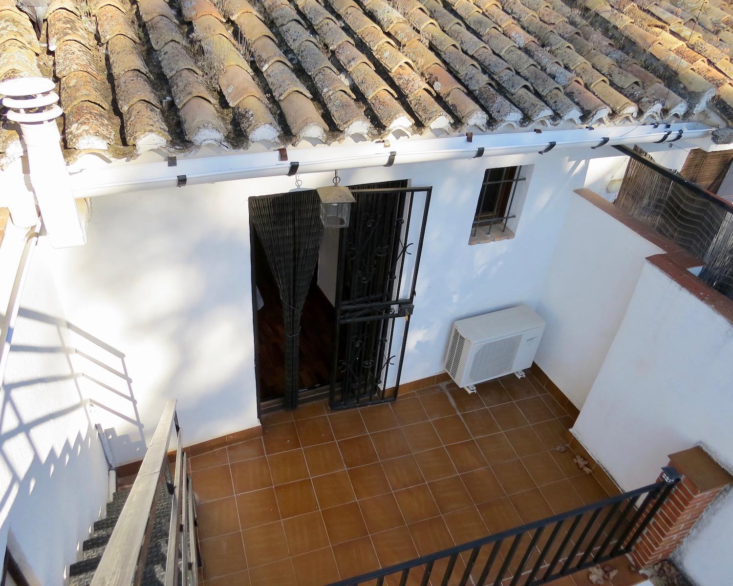 From the side entrance, there is access to the charming patio and doors through to the living room with fireplace and another set of French doors to the third part of the house. This third part was originally connected by means of a door through to the entrance hall from the main door and could be reconnected easily. Downstairs is a light open plan living room / dining room with kitchenette. A gorgeous, wooden spiral staircase leads up to a bedroom with fitted cupboards and an en suite bathroom. French doors allow for lots of natural light and access to a balcony with views of the patio and the Alhambra in the distance and stairs lead up once again to a third terrace with views of the Alhambra and the Albayzín.