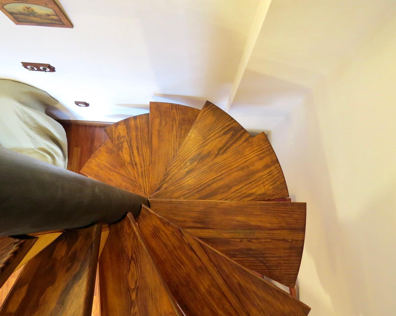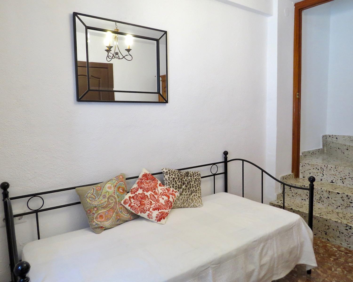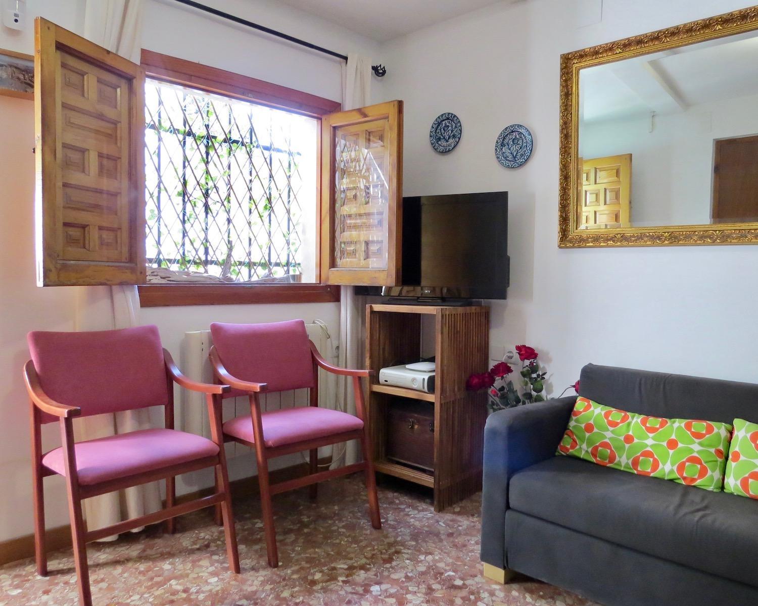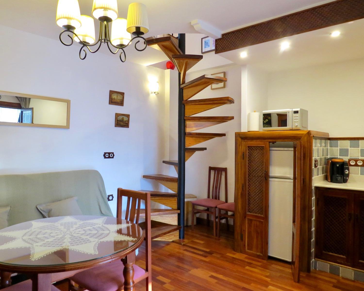From the side entrance, there is access to the charming patio and doors through to the living room with fireplace and another set of French doors to the third part of the house. This third part was originally connected by means of a door through to the entrance hall from the main door and could be reconnected easily. Downstairs is a light open plan living room / dining room with kitchenette. A gorgeous, wooden spiral staircase leads up to a bedroom with fitted cupboards and an en suite bathroom. French doors allow for lots of natural light and access to a balcony with views of the patio and the Alhambra in the distance and stairs lead up once again to a third terrace with views of the Alhambra and the Albayzín.