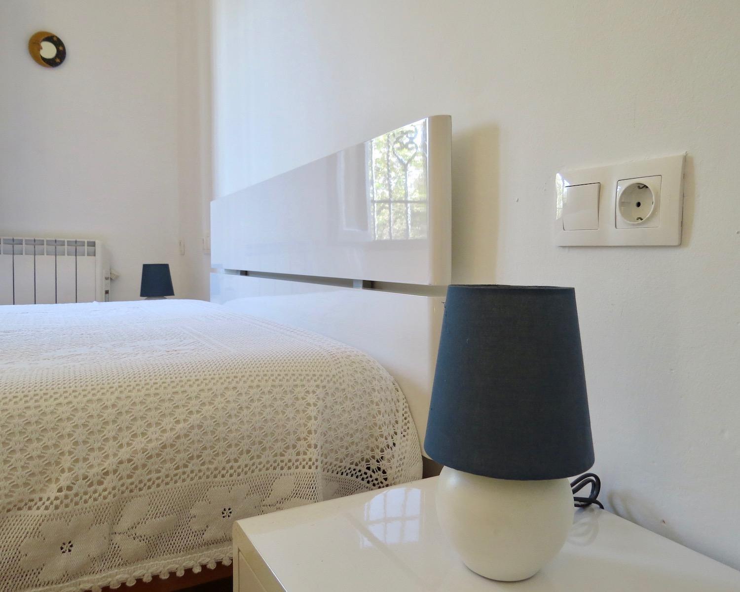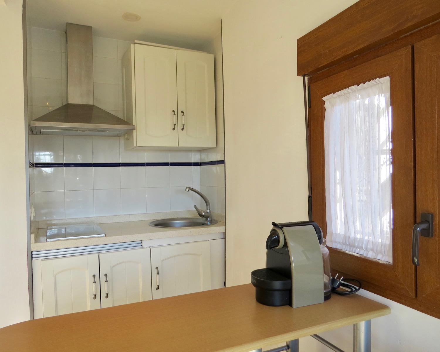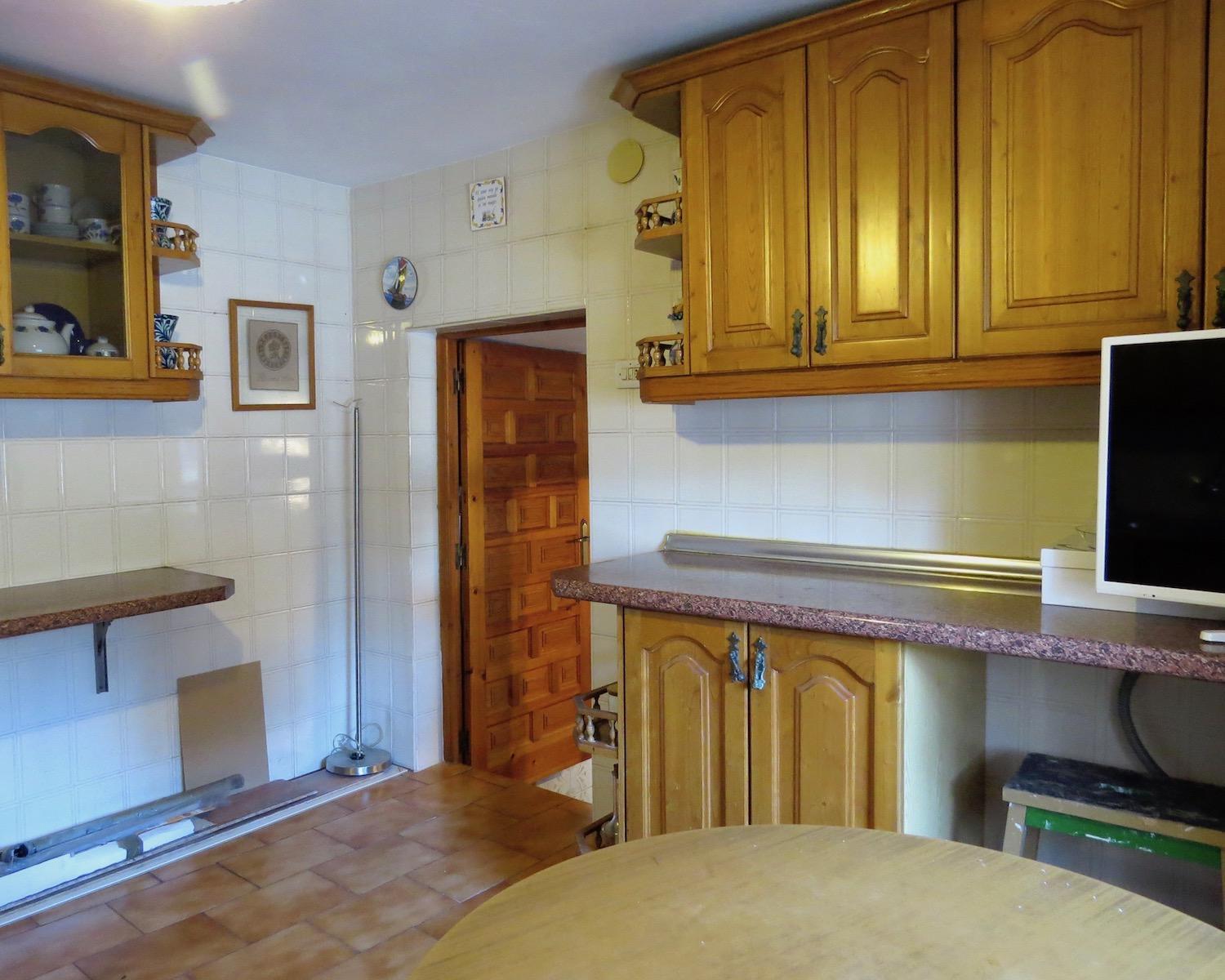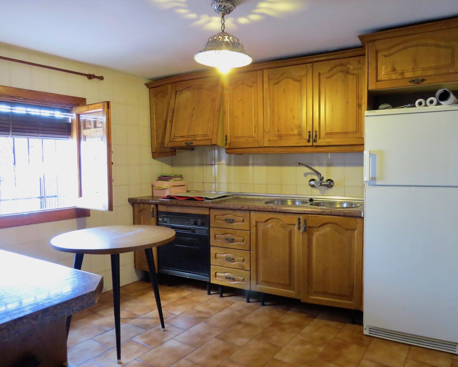 Through the right door in the entrance hall is the core of the house, which has the fireplace and main kitchen. There is a living / dining room with a fireplace (which has been covered up with a board but which is completely functional). On the one side a door leads to the patio and on the other side a passageway leads to the bathroom with shower and a kitchen with views over the patio. This part of the house could be used as a second apartment, with access from the patio or from the entrance hall on the other side.