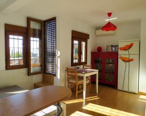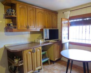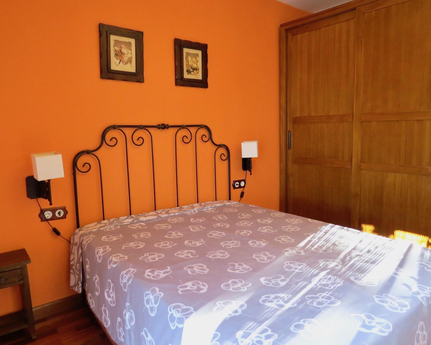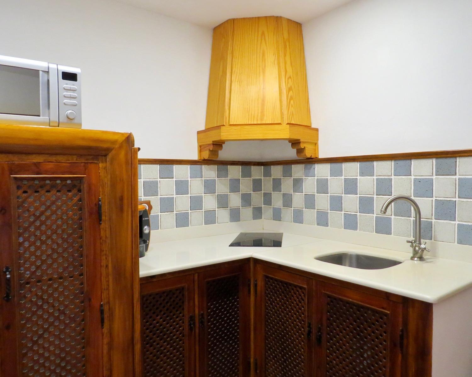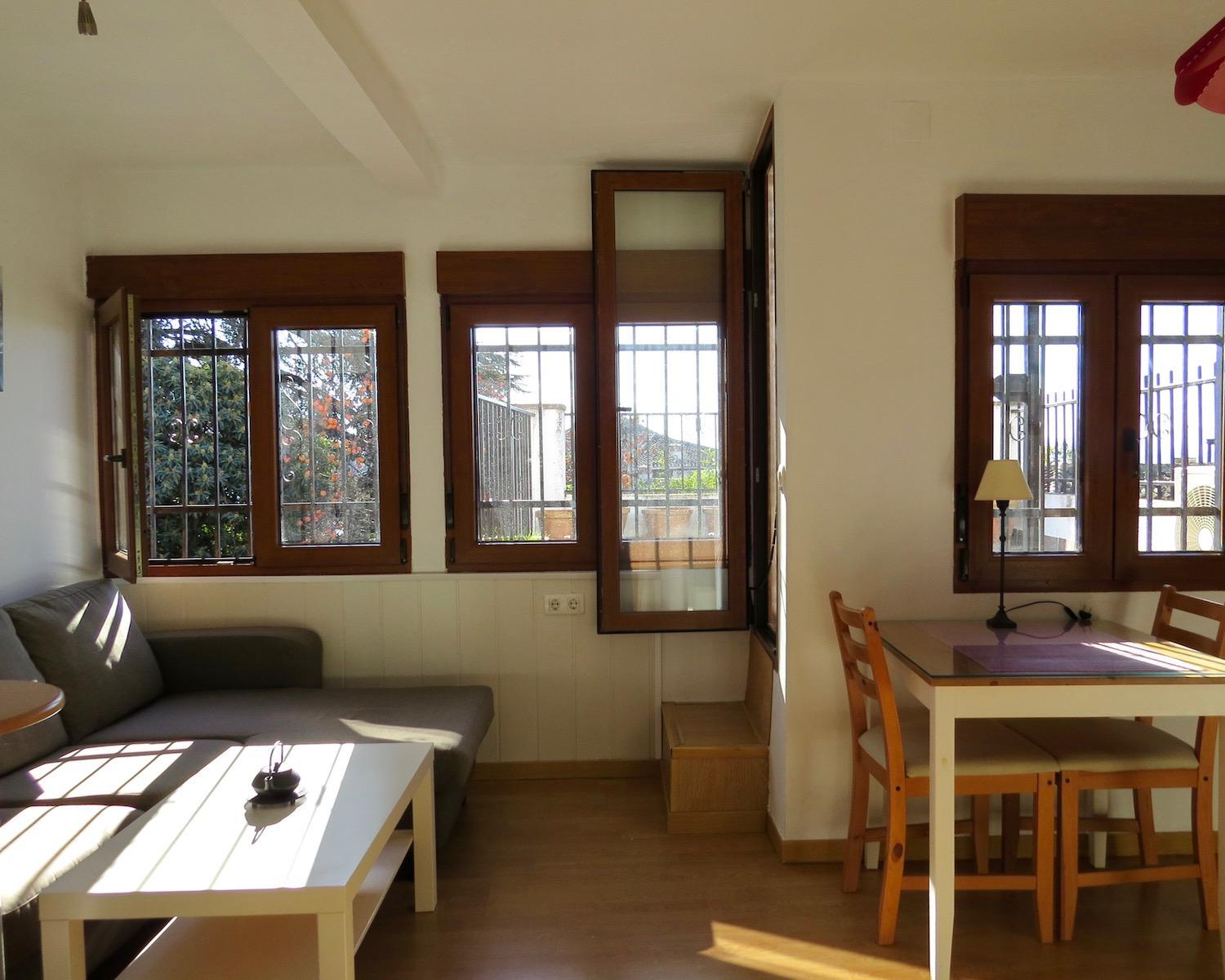 Through the right door in the entrance hall is the core of the house, which has the fireplace and main kitchen. There is a living / dining room with a fireplace (which has been covered up with a board but which is completely functional). On the one side a door leads to the patio and on the other side a passageway leads to the bathroom with shower and a kitchen with views over the patio. This part of the house could be used as a second apartment, with access from the patio or from the entrance hall on the other side.
