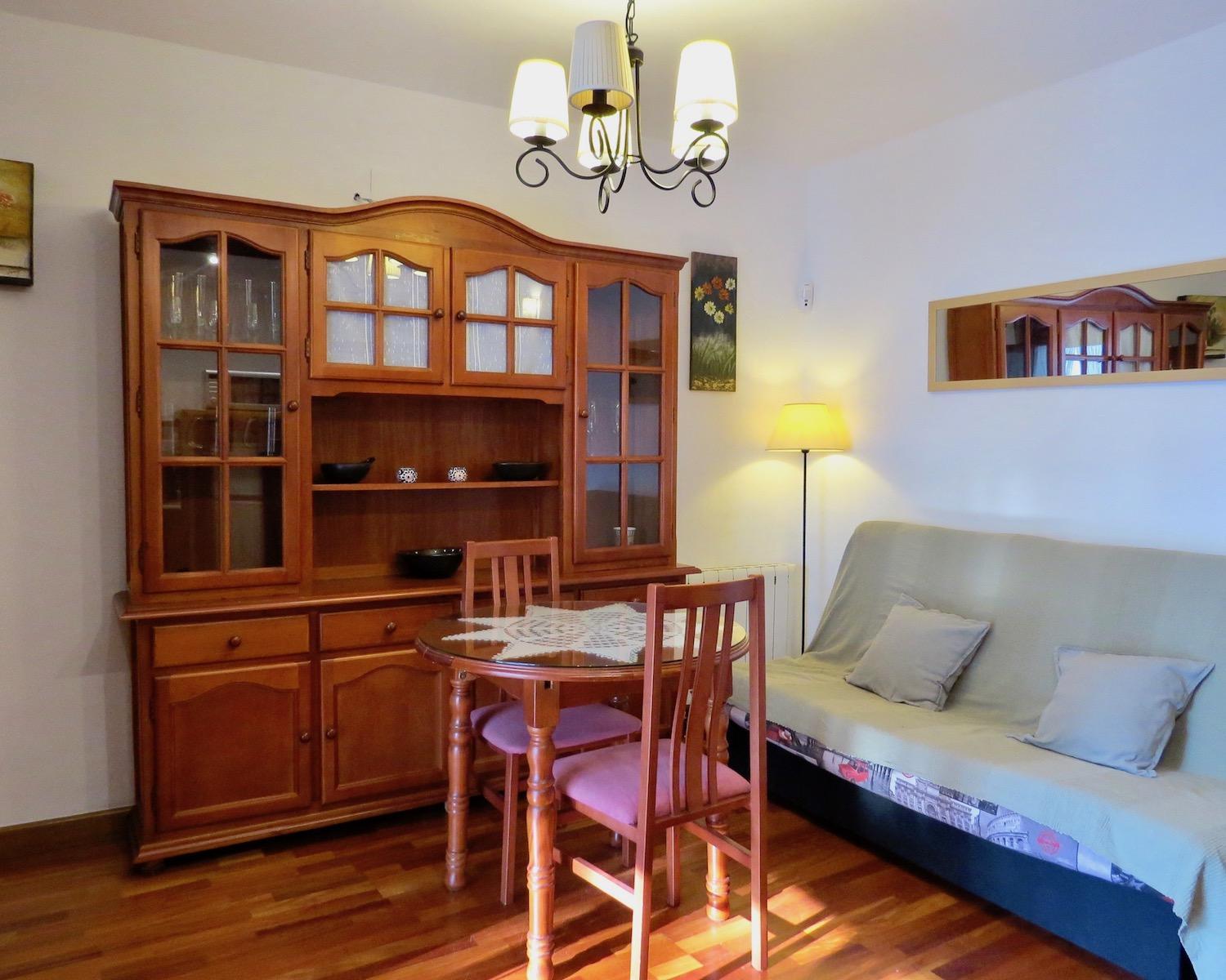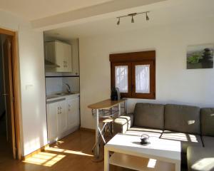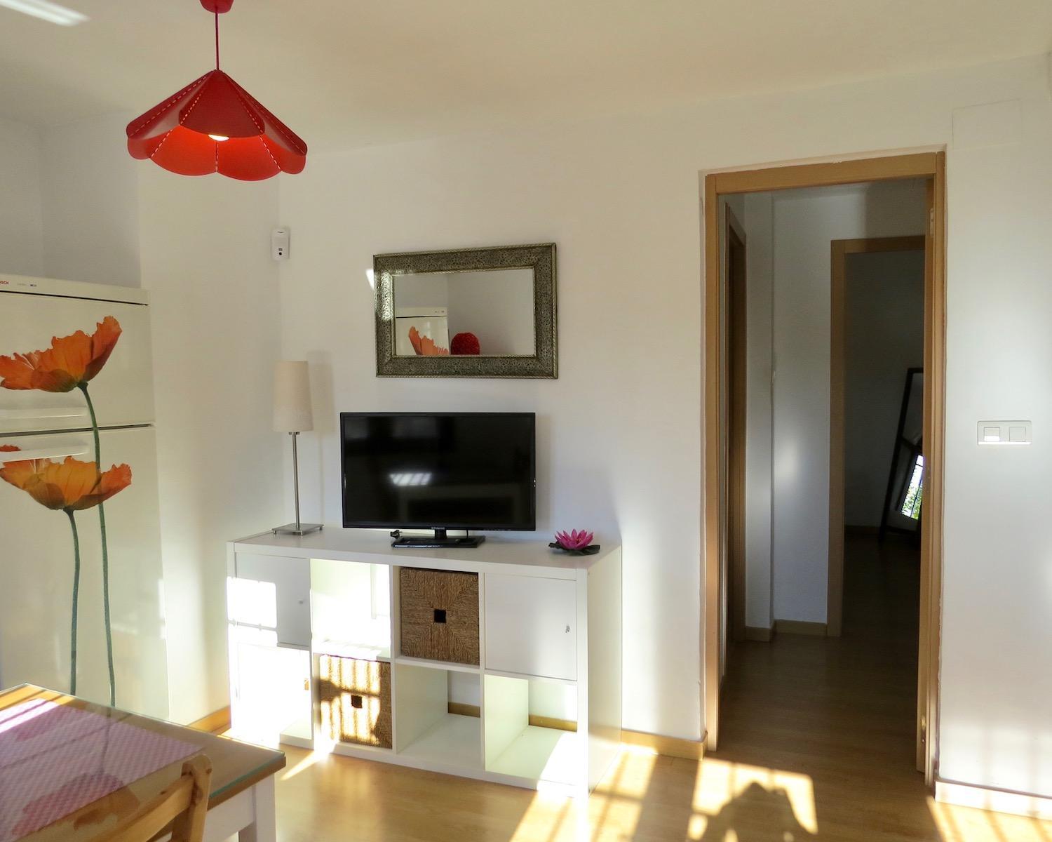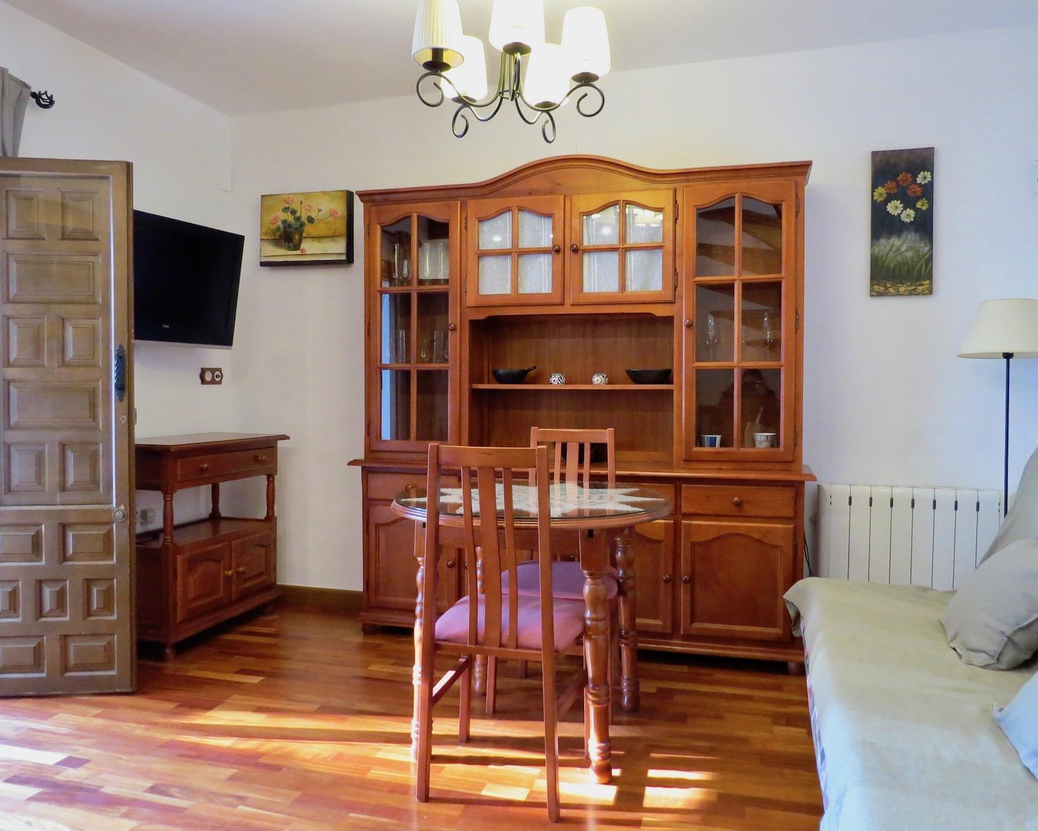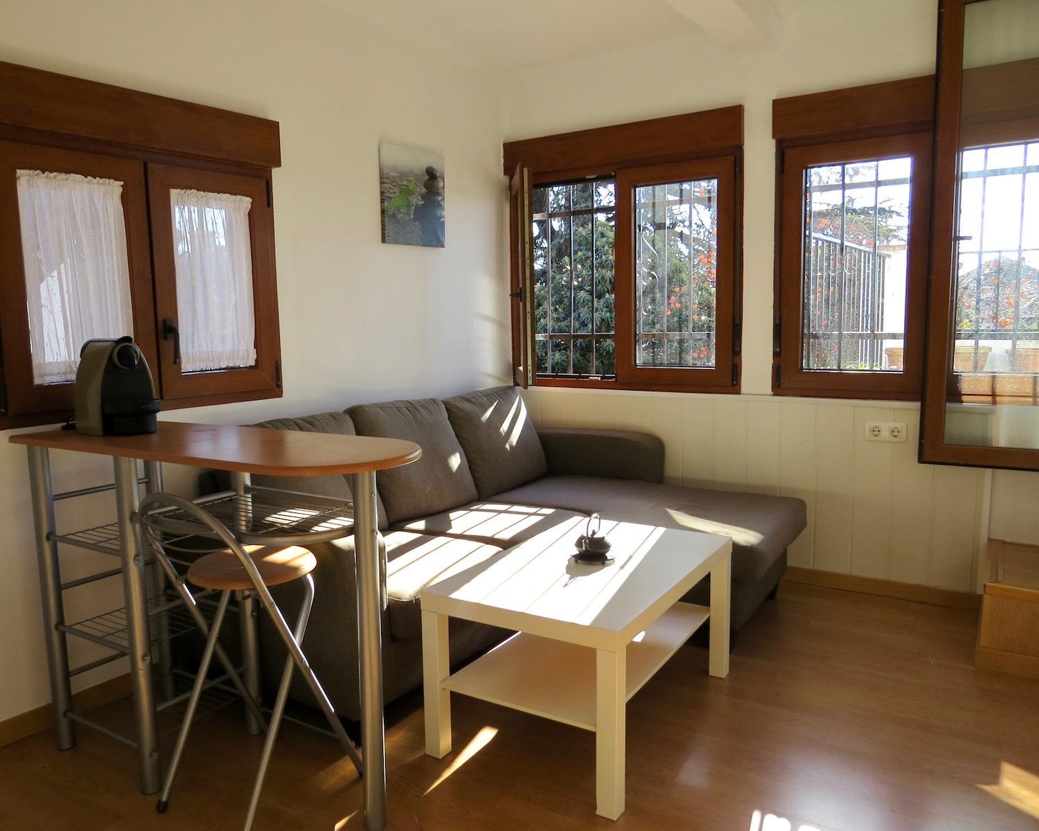 Through the right door in the entrance hall is the core of the house, which has the fireplace and main kitchen. There is a living / dining room with a fireplace (which has been covered up with a board but which is completely functional). On the one side a door leads to the patio and on the other side a passageway leads to the bathroom with shower and a kitchen with views over the patio. This part of the house could be used as a second apartment, with access from the patio or from the entrance hall on the other side.