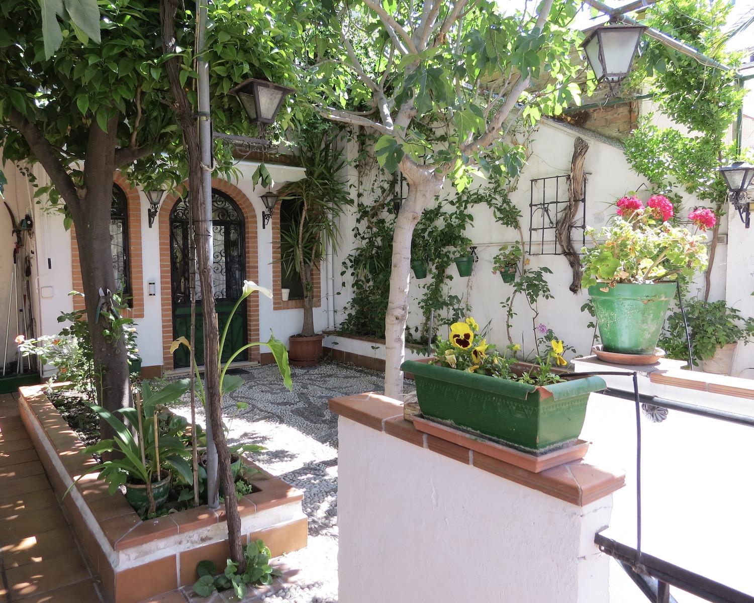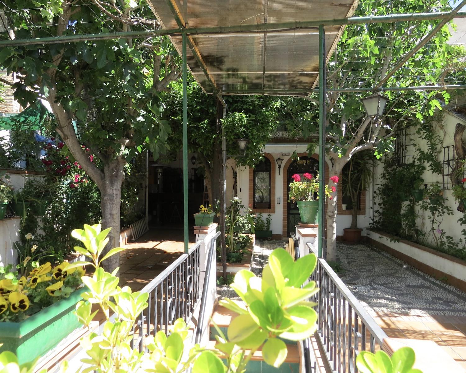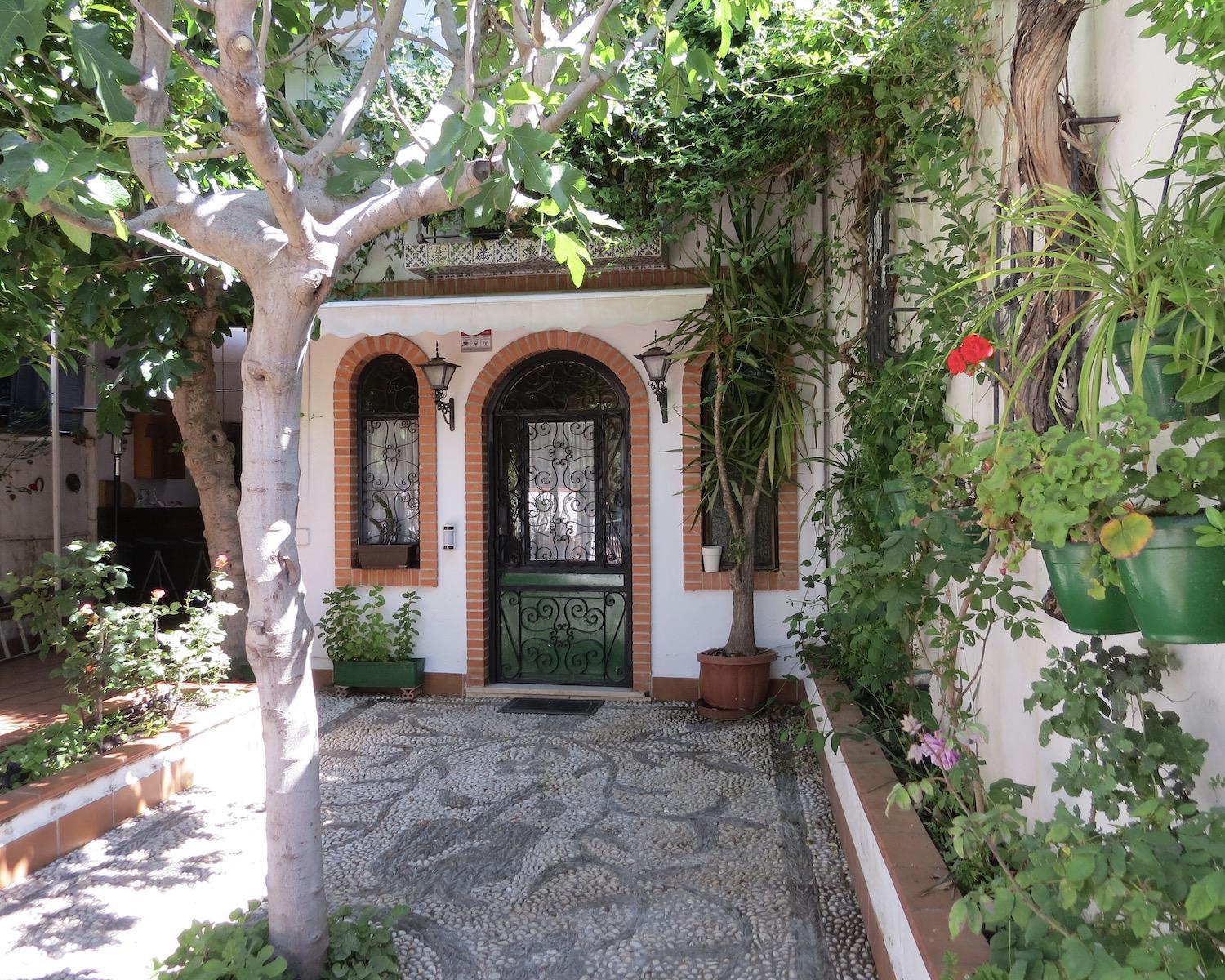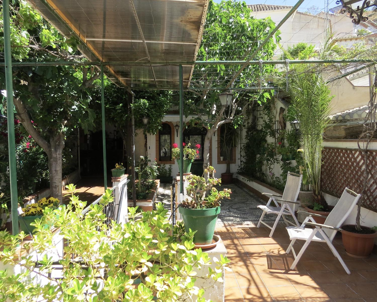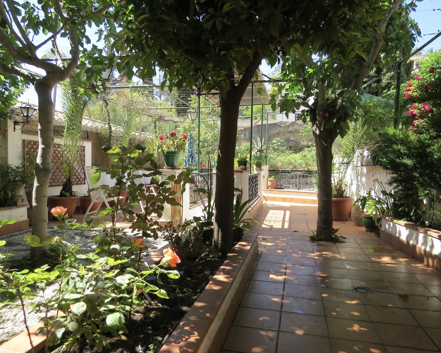 The property has two entrances, one below and one above, both with street access. The conveniently located bottom entrance leads in past the garage and up a flight of stairs to the gorgeous, ample and truly relaxing patio from which one can hear constant birdsong. The patio, partially cobblestoned in the typical Granadan style, has a very well-maintained and mature garden, with several rose bushes as well as three big fig trees, an orange tree, a loquat tree and a grapevine that provide excellent shade in summer and shed their leaves in winter, allowing the light and warmth to flood in. The patio has several seating areas including an outside, covered bar area with a storage space.