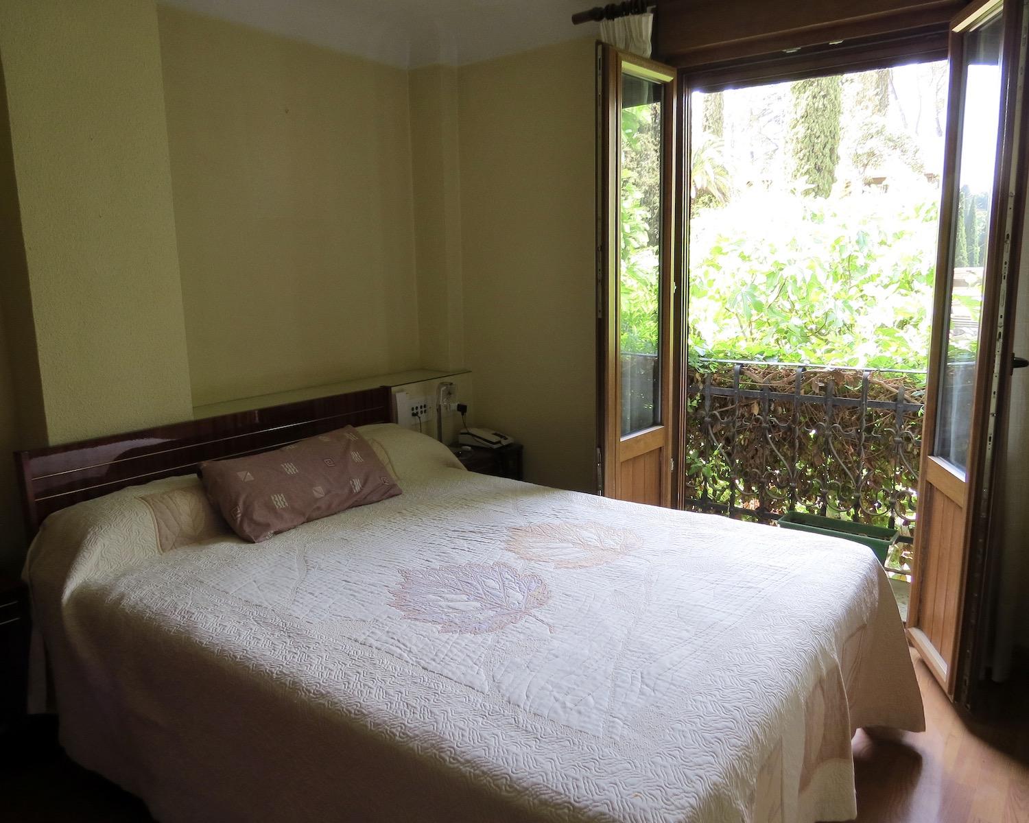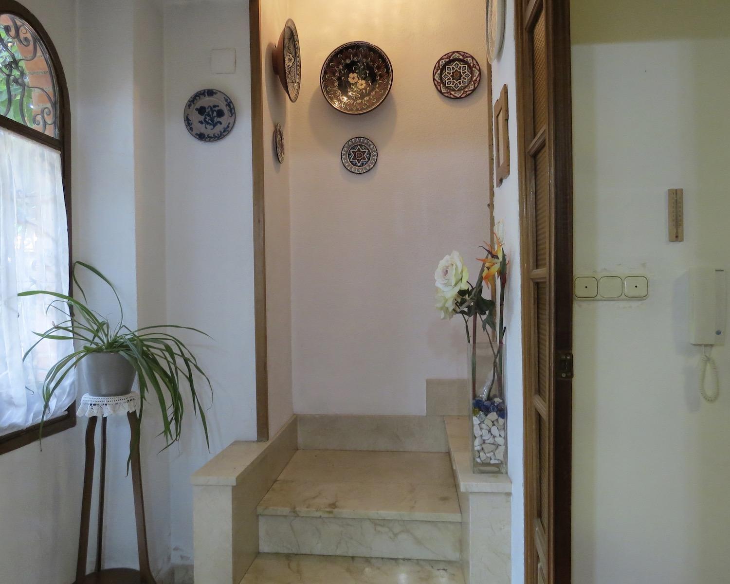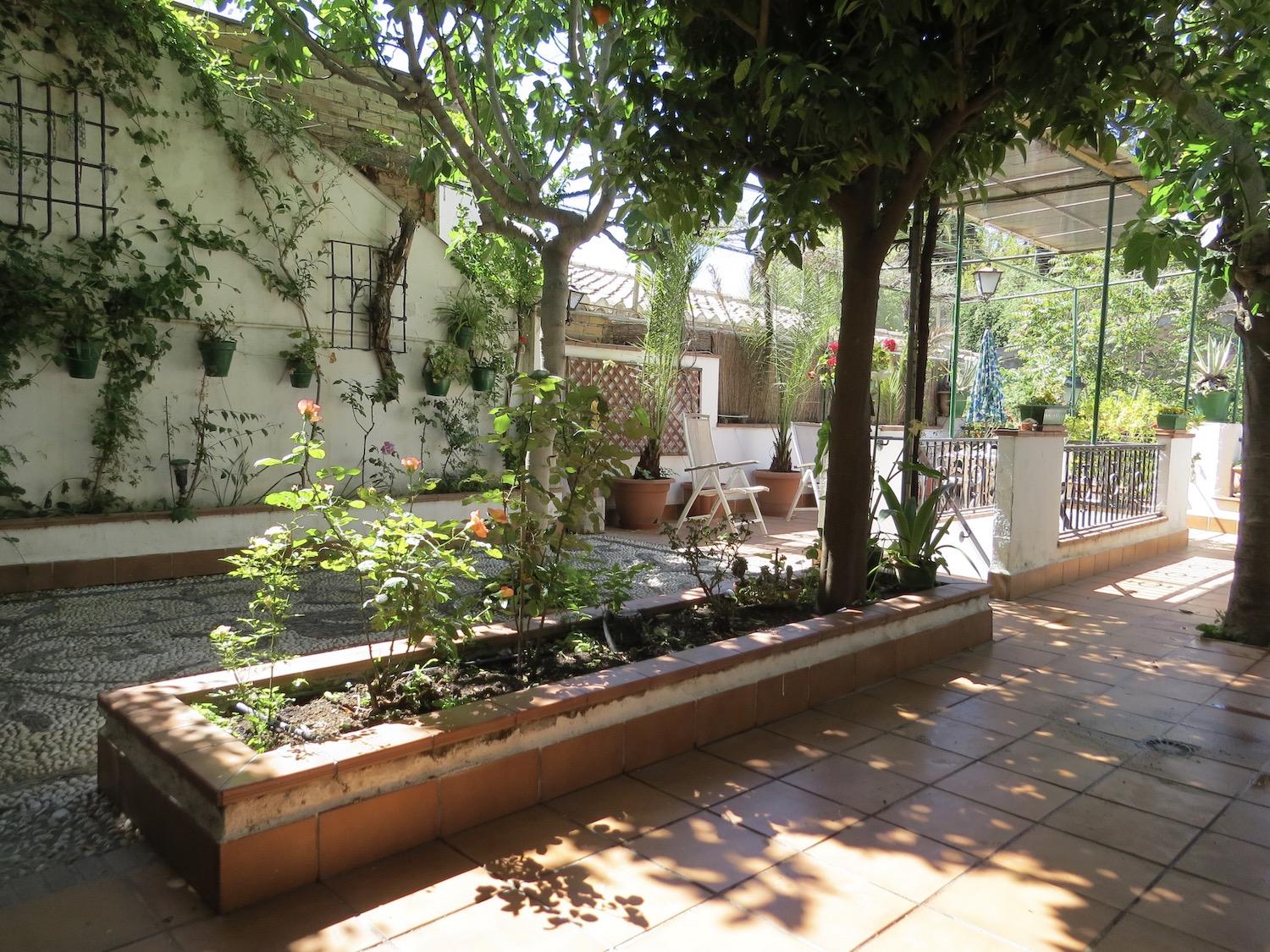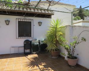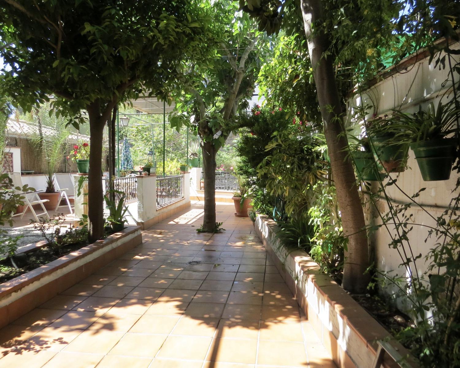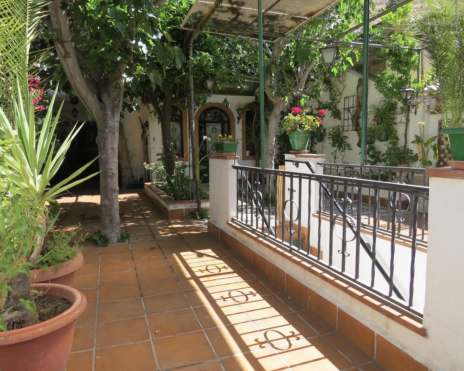 The property has two entrances, one below and one above, both with street access. The conveniently located bottom entrance leads in past the garage and up a flight of stairs to the gorgeous, ample and truly relaxing patio from which one can hear constant birdsong. The patio, partially cobblestoned in the typical Granadan style, has a very well-maintained and mature garden, with several rose bushes as well as three big fig trees, an orange tree, a loquat tree and a grapevine that provide excellent shade in summer and shed their leaves in winter, allowing the light and warmth to flood in. The patio has several seating areas including an outside, covered bar area with a storage space.