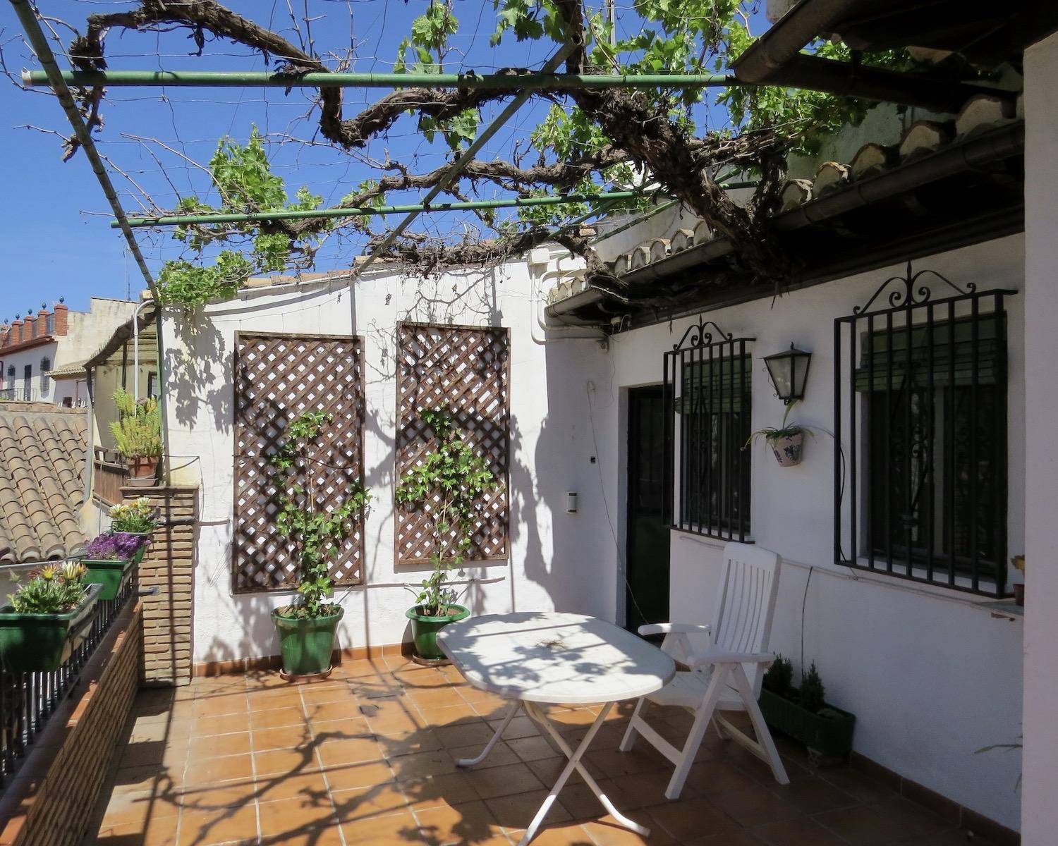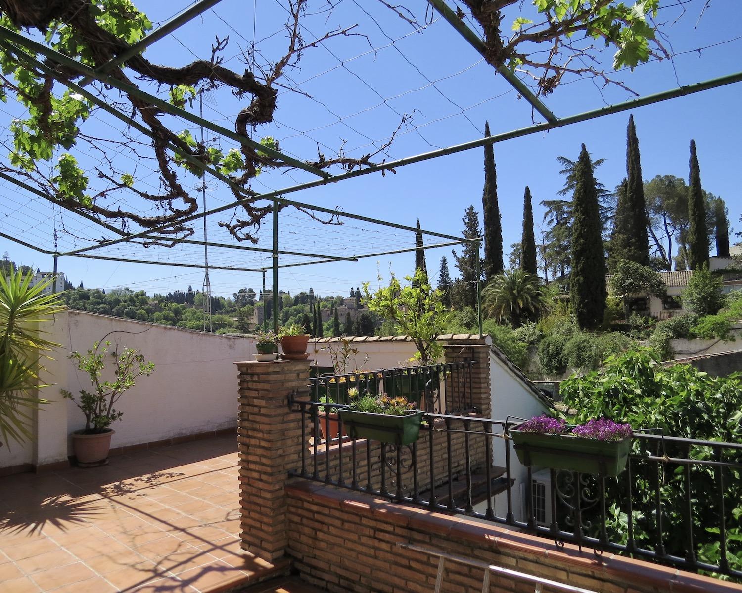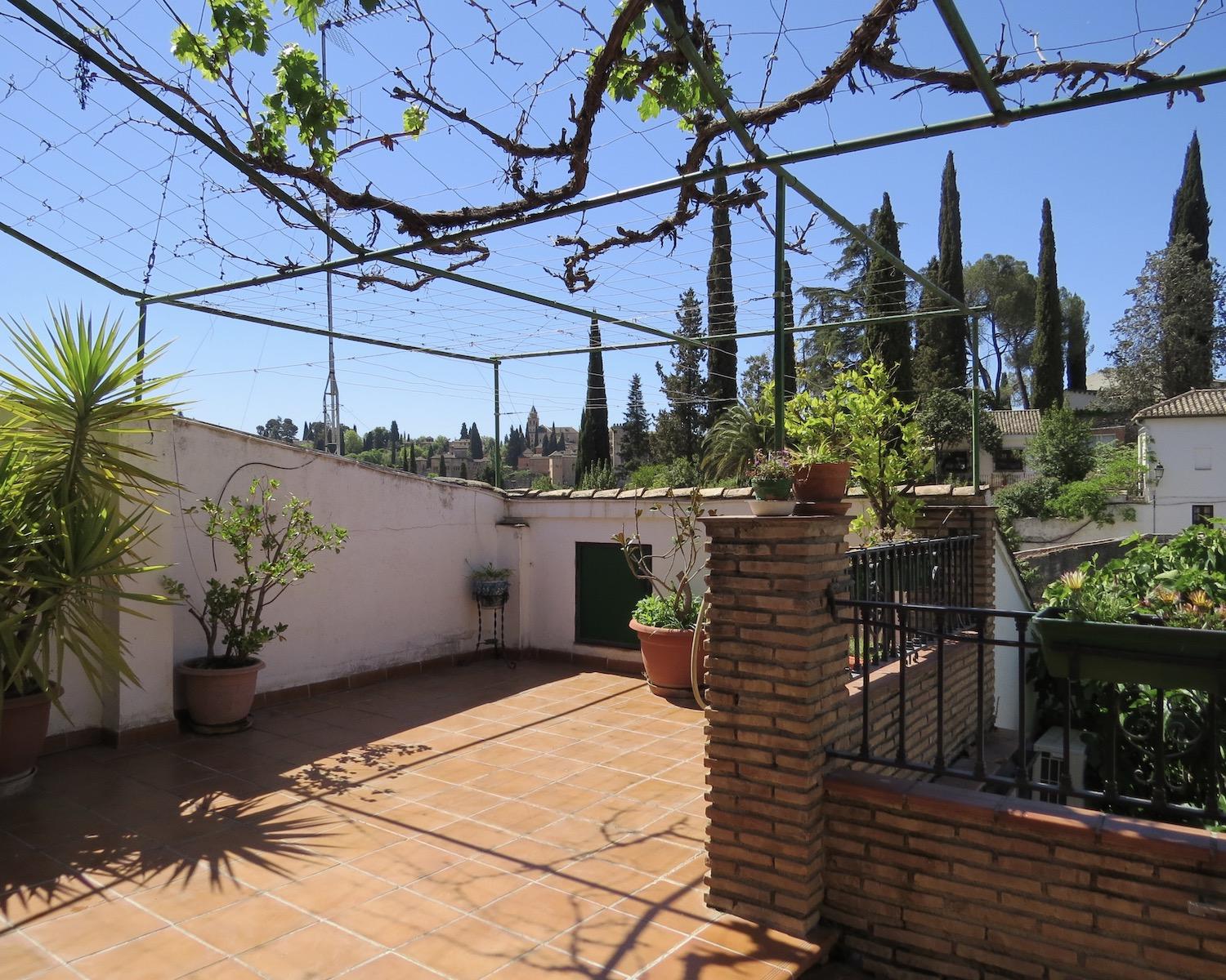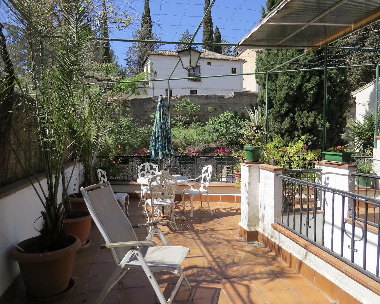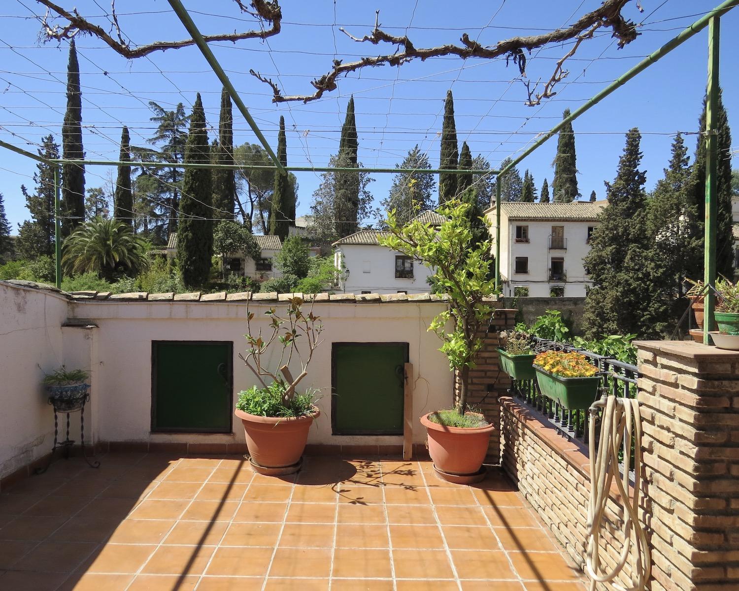 On the stairs leading up to the second floor is the upper entrance. Continuing up to the second floor, a door leads out to the spacious, sunny terrace, complete with a grapevine, lemon tree and various creeping ivy plants trained up wooden trellises. The terrace has stunning views of the Alhambra and Generalife and is a great place for winter months while the patio below offers cool shade for summer. The second floor also has a third bedroom with fitted wardrobes and a large utility room that could be converted into a bathroom if desired.