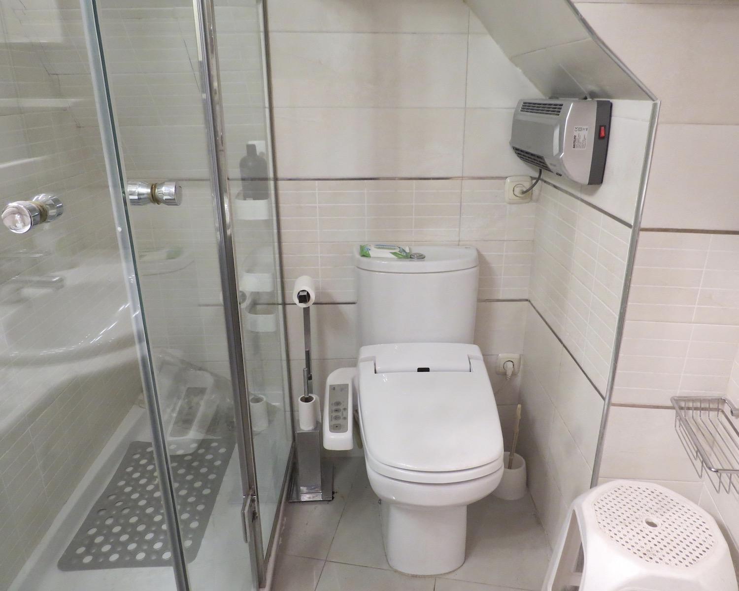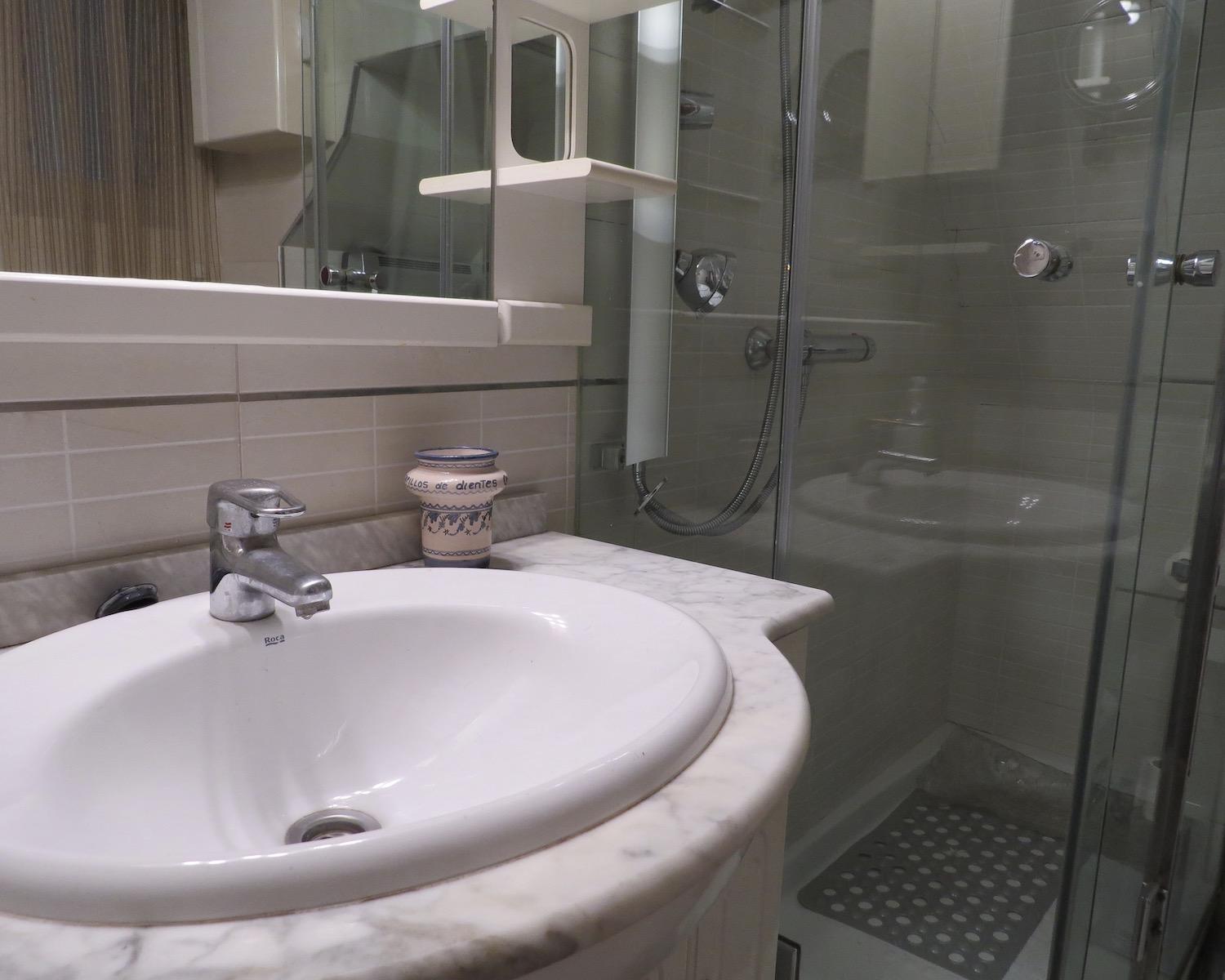 From the patio, the front door leads into the downstairs area which consists of a bathroom with shower, a gentleman's living room / library and a large double bedroom with ample cupboard space. This floor remains notably fresh and cool in summer months.