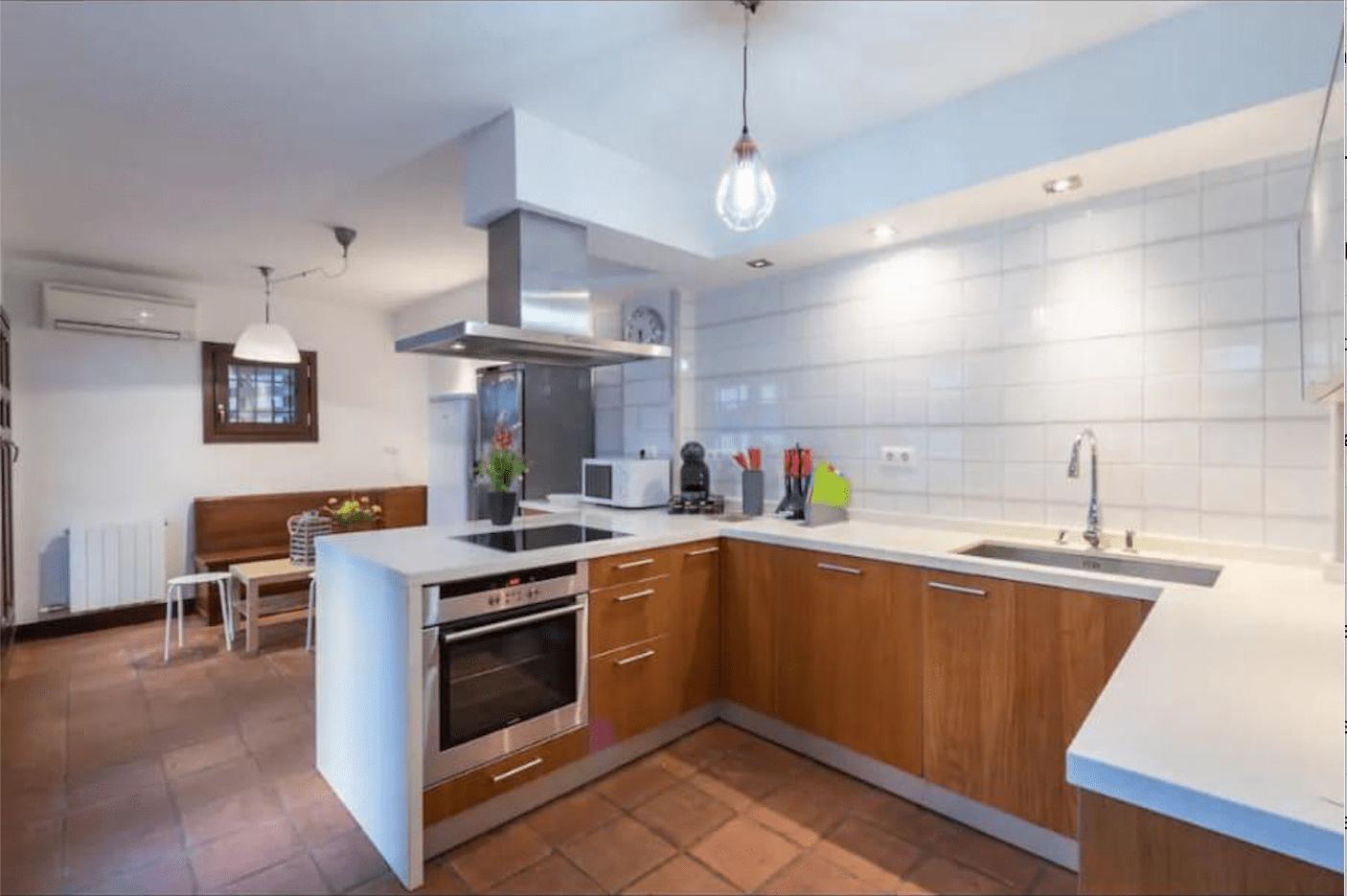 On the lowest level there is a fully equipped modern kitchen with double doors out to a green and intimate, enclosed patio.