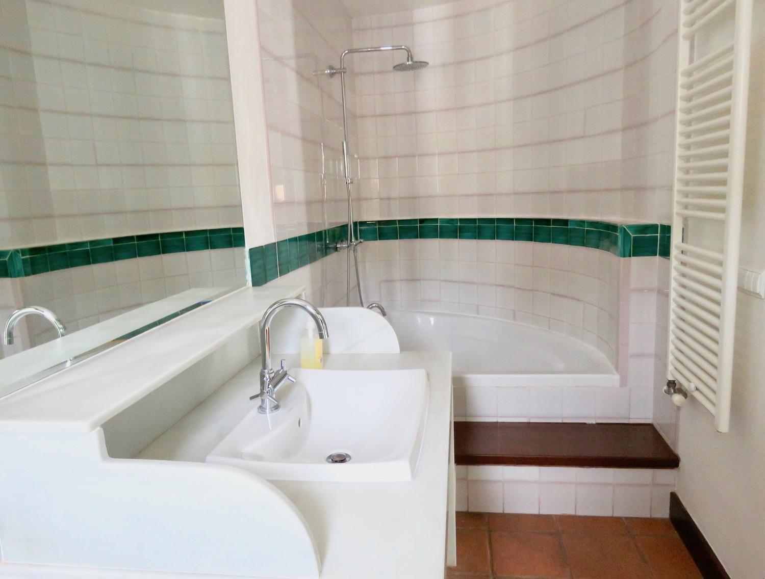 On the next level there is a long bedroom with en suite bathroom with glass walls offering natural light at all times of day. There are two more double bedrooms, one with an en suite bathroom.