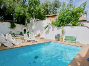 In the pool area there is a built-in barbecue and the gardens are surrounded by trees.